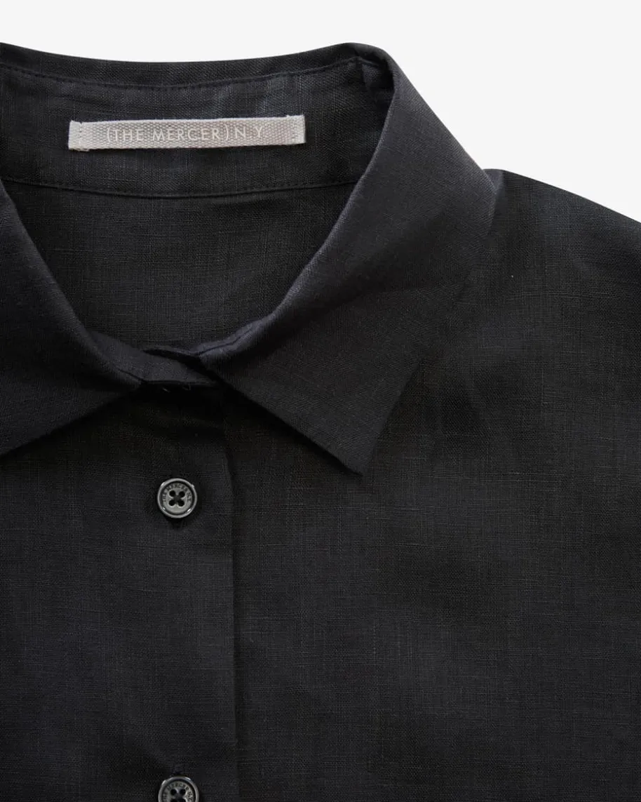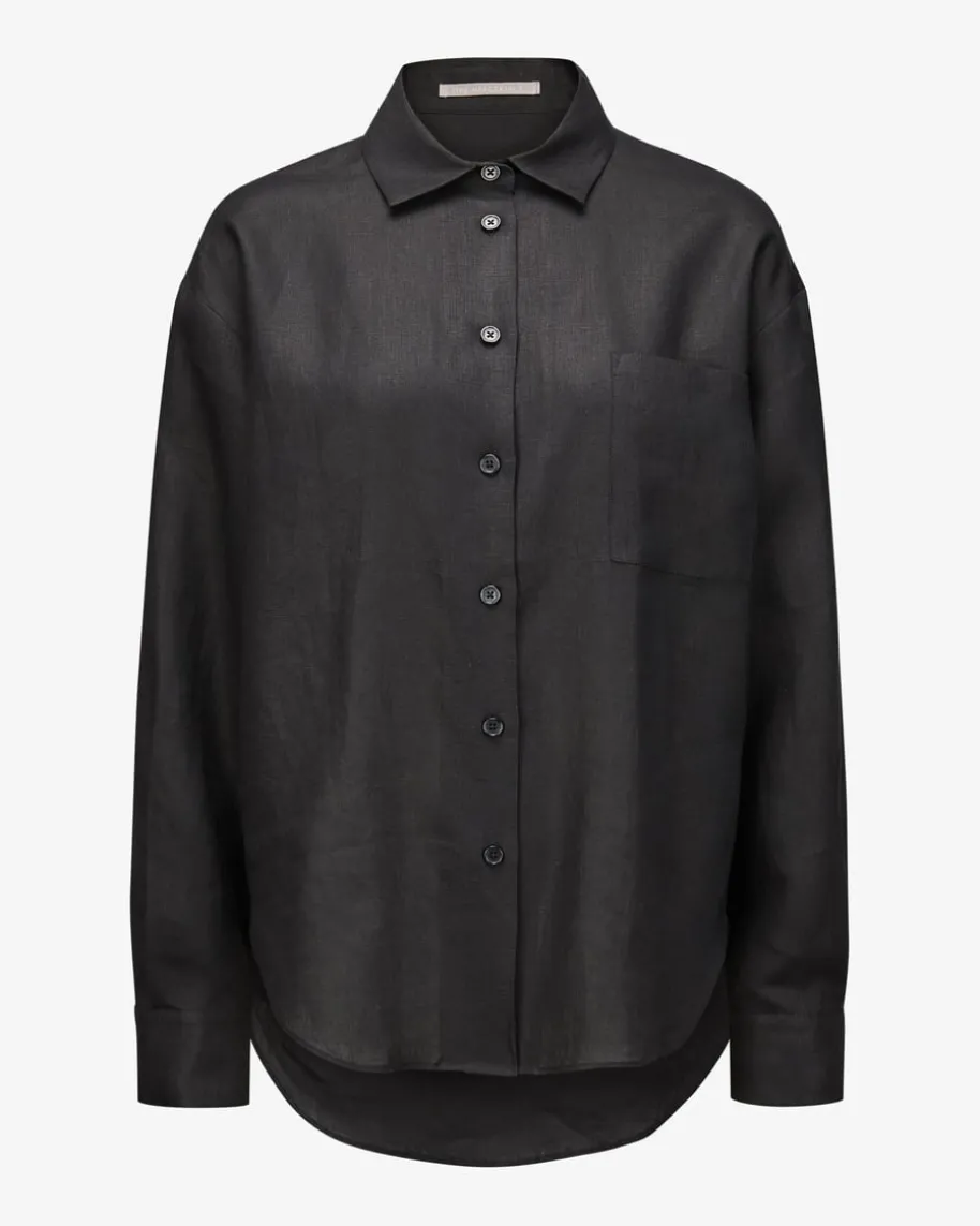 Leinen-Hemdbluse für Damen von (The Mercer) N.Y. in Schwarz. Dieses cleaneModell überzeugt mit angenehm-leichter Leinen-Qualität in semitransparenterOptik und legerer Passform mit verlängerter Rückseite, während klassischeDetails ein stilvolles Gesamtbild schaffen.