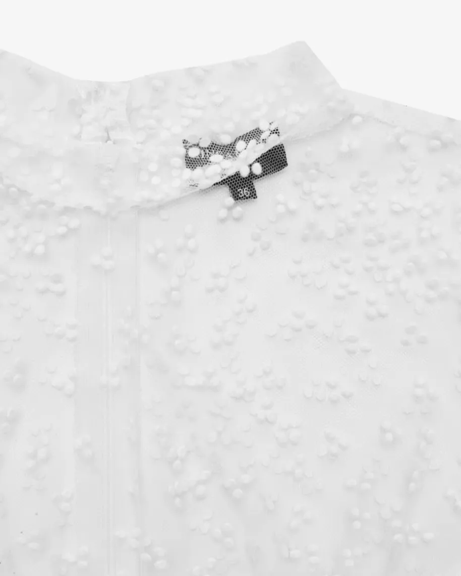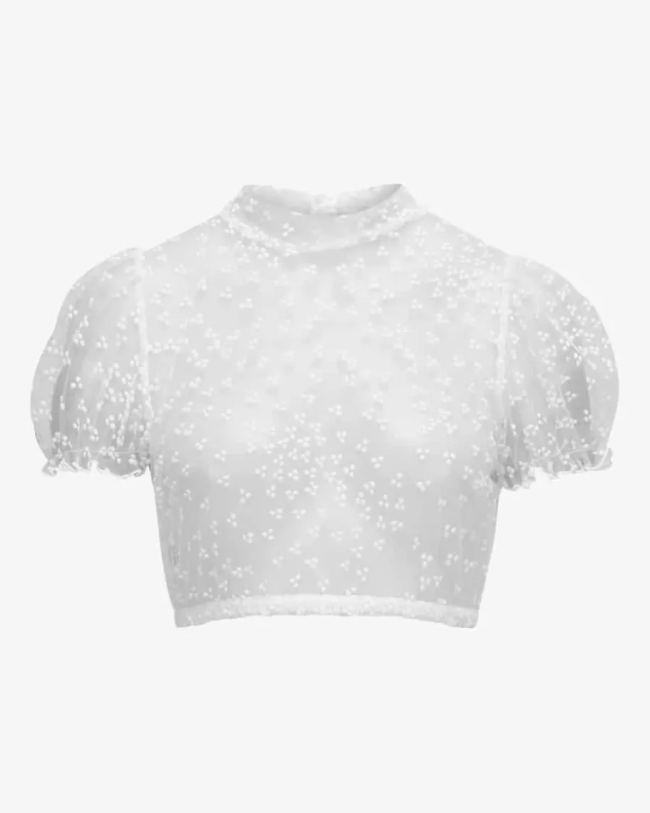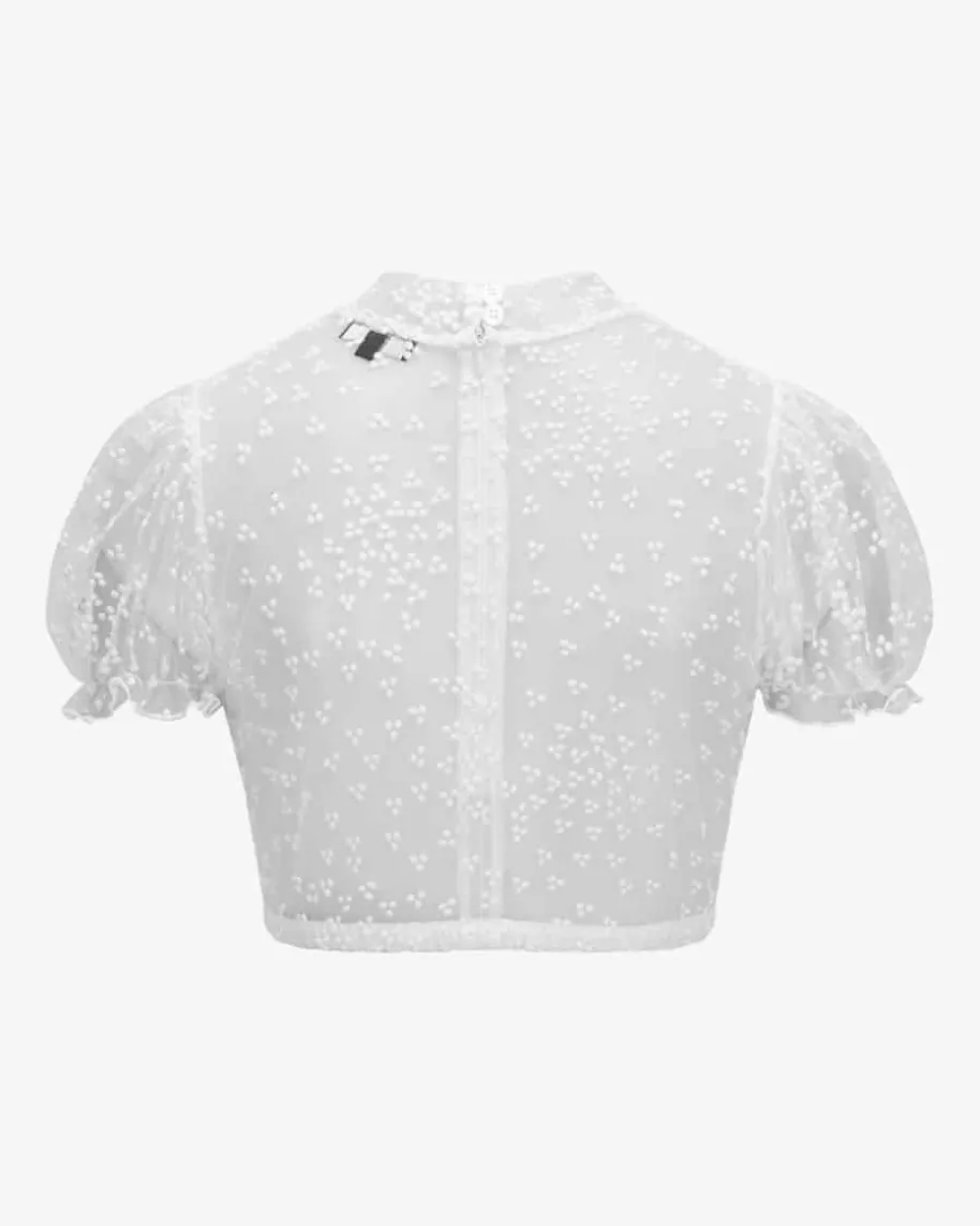 Leni Dirndlbluse Transparent für Damen von Kinga Mathe inWeiß. Dashochgeschlossene Modell mit Puffärmeln zeichnet sich durchdie semi-transparenteTüll-Qualität aus, welche dank feinem Punktemuster stilvollergänzt wird – Einromantischer Begleiter für Ihren Trachten-Look.