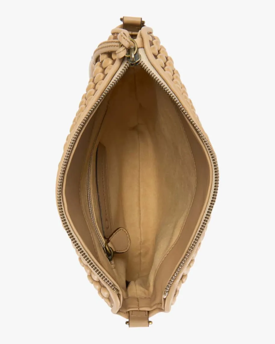 Liberty Umhängetasche für Damen von Tissa Fontaneda in Camel. Das 2010gegründete Label vereint Handwerkliches Können und Liebe zum Detail. Die soforterkennbare „Bubble Bag“ ist zum Markenzeichen der Kollektion Tissa Fontanedageworden. Auch dieses Modell begeistert in charakteristischer Aufmachung mitstrukturierter Optik, während der breite Schulterriemen sportive Akzente setzt.