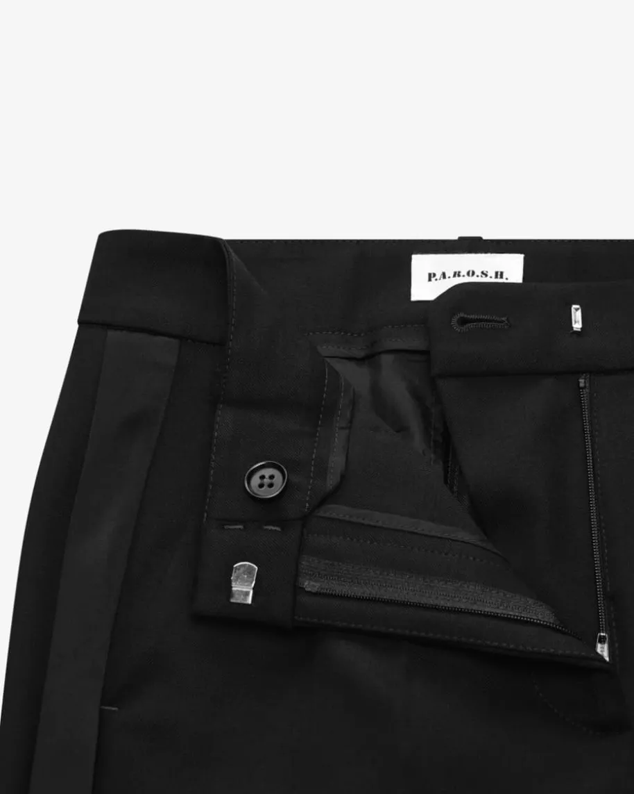 Liliuxy25 Smoking-Hose für Damen von Parosh in Schwarz. Der elegante Stil vonParosh sowie ein moderner Military-Stil, machen die Kollektionen so besonders.Auch dieses schmale Modell überzeugt mit edler, elastischer Schurwoll-Qualität,während klassisch-elegante Details sowie die seitlichen Galonstreifen in Satin-Optik einen stilvollen Smoking-Charakter verleihen.