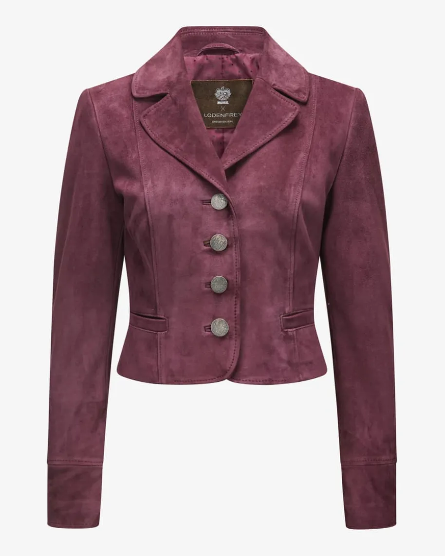 Linderhof Trachten-Lederjacke für Damen von Meindl in Dark Cherry. Lederhandwerkaus Bayern – Bereits 1693 wurden bei Meindl die ersten Produkte aus Ledergefertigt und seit nun mehr als 70 Jahren fertigt das Traditionshaus hochwertigeLederwaren, die von Kennern meist ein Leben lang geschätzt werden. Während dasweiche Ziegenleder die traditionelle Aufmachung gekonnt untermalt, überzeugt dastaillierte Modell aus der exklusiven LODENFREY-Kollaboration dank klassischerDetails und den handgemachten Wappenknöpfen mit femininem Charme.