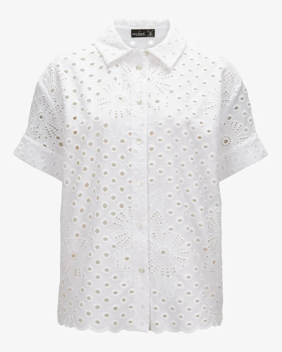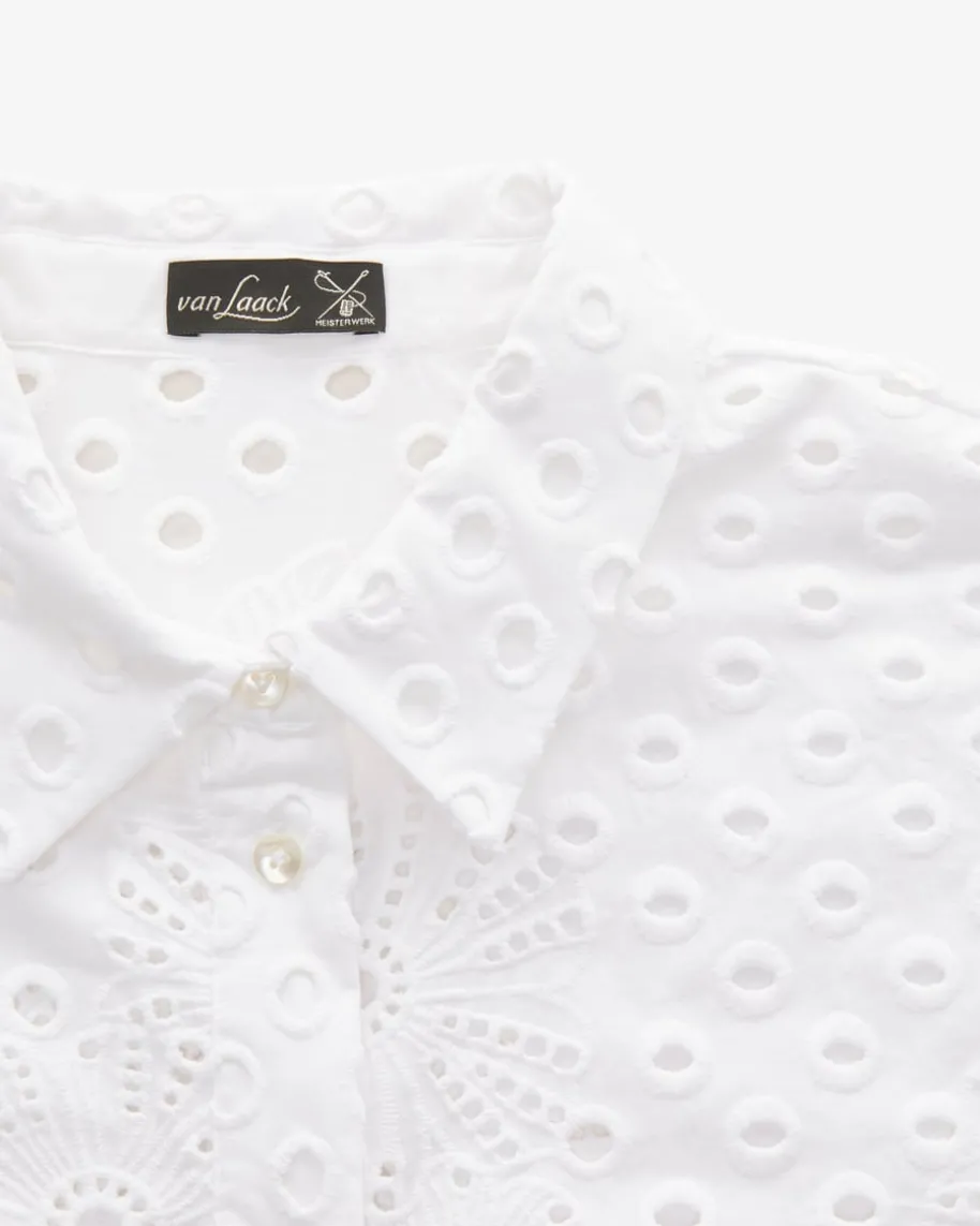 Litea Blusenshirt für Damen von van Laak in Weiß. Das Modell präsentiert sichmit modischer Lochspitze und klassischen Details, während die Perlmuttknöpfe undhochwertiger Baumwoll-Qualität für angenehmen Tragekomfort sorgt.
