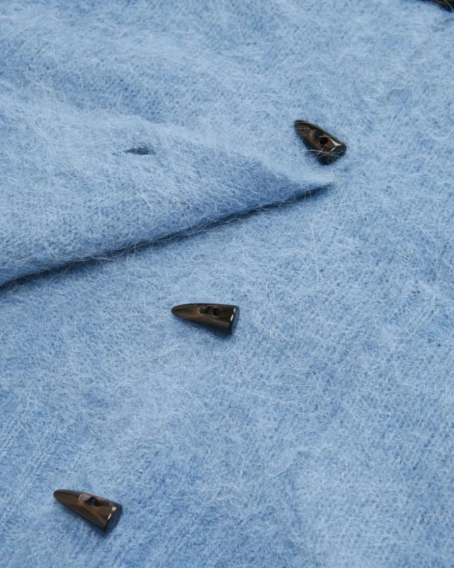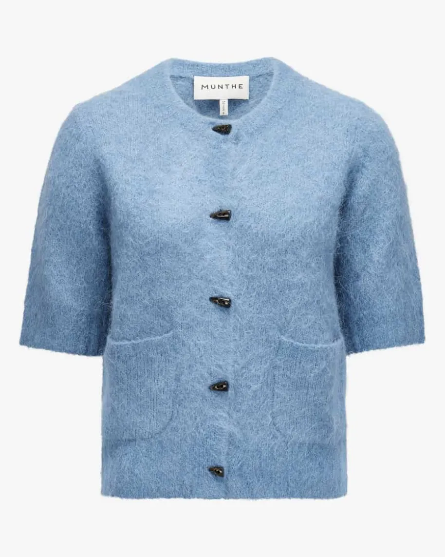 Locca Strickjacke für Damen von Munthe in Hellblau. Das skandinavische Label ausKopenhagen – feminin & cool. Auch dieses kurzärmlige Modell begeistert mitmarkanten Knöpfen und weicher Brushed Optik aus Alpakawolle-Mix, der angenehmeTragemomente garantiert.