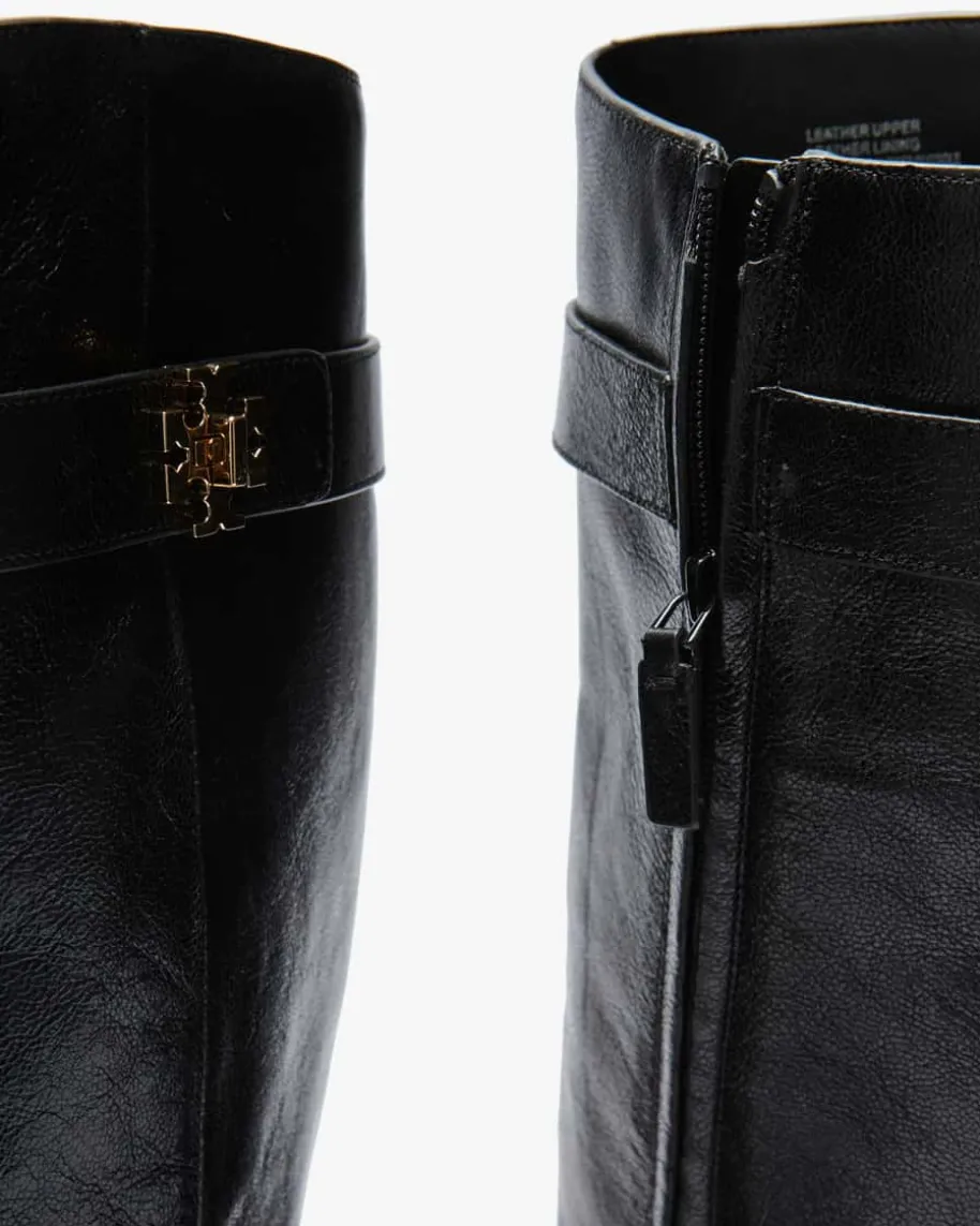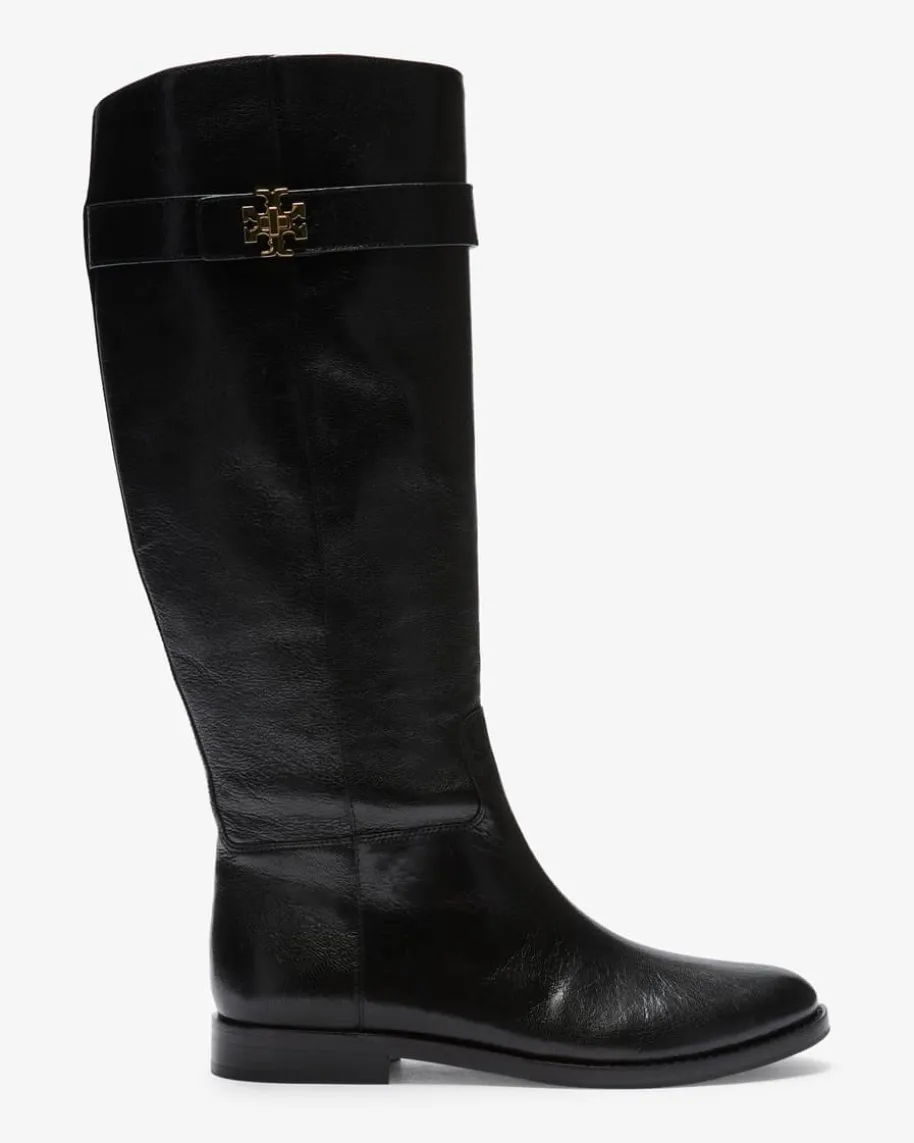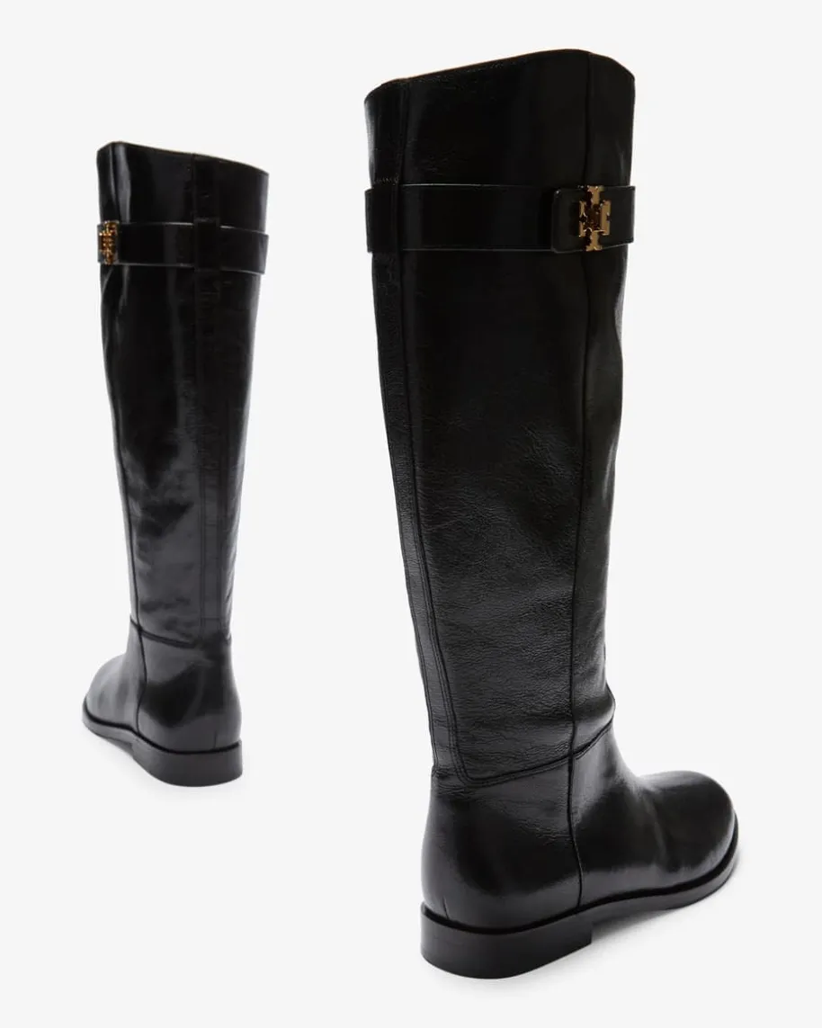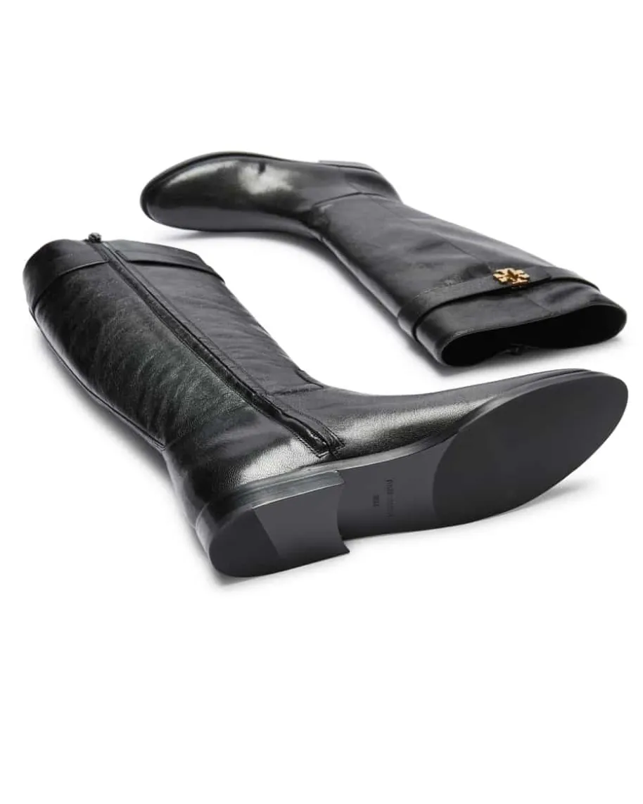 Lock Riding Boot Stiefel für Damen von Tory Burch in Schwarz. Mit diesem Modellhat das Label einen klassischen Begleiter kreiert, der in keiner Garderobefehlen sollte. Die schlichte Eleganz wird durch eine changierende, goldfarbeneLogo-Schließe stilvoll komplettiert, während die dezent genarbte Leder-Verarbeitung ein edles Finish verleiht.