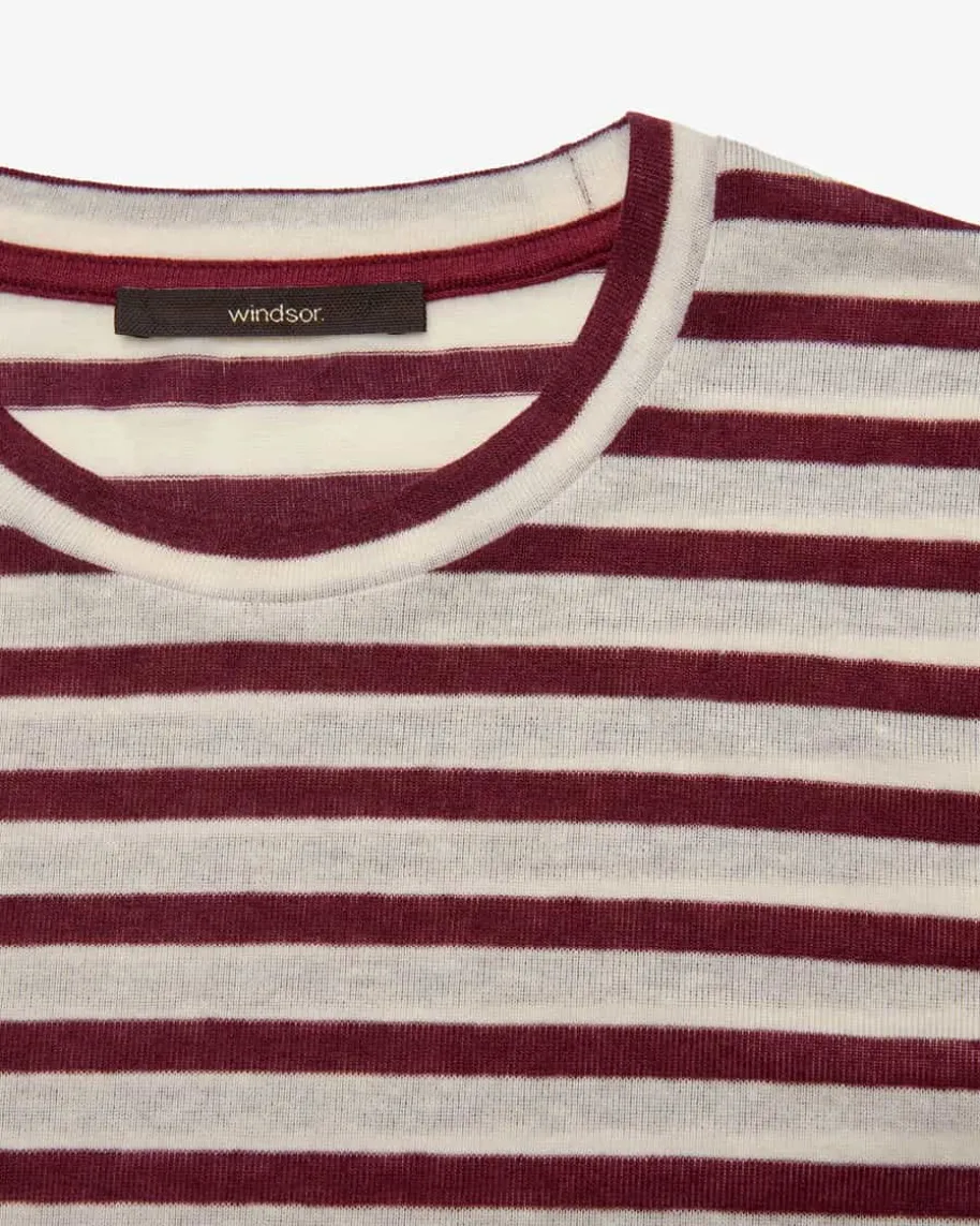 Longsleeve für Damen von Windsor in Bordeaux und Creme. Das gestreifte Modellzeichnet sich besonders durch die elastische Kombination aus Lyocell und Wolleaus, welche dank der Feinstrick-Qualität eine angenehme Haptik erhält – Einmoderner Layering-Favorit.