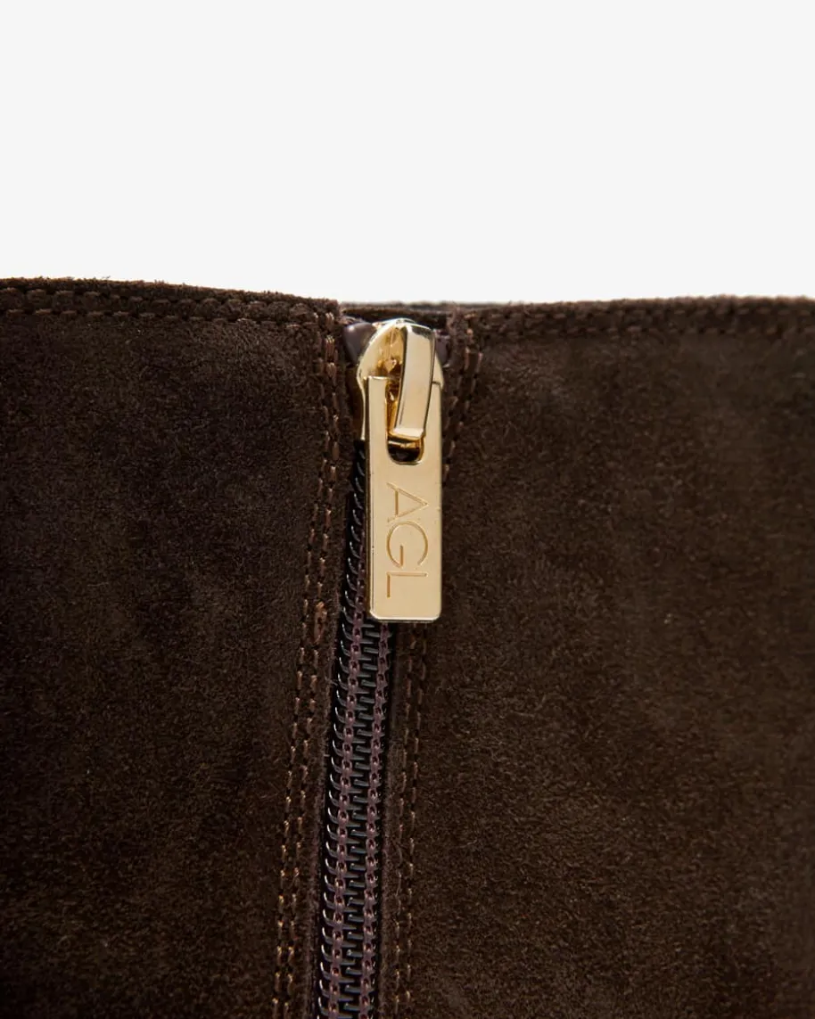 Loren Biker-Boots für Damen von AGL in Dunkelbraun. Ein saisonaler Allrounder –egal ob zum romantischen Kleid oder rockigen Lederhose getragen. Das Modell inhochwertiger Veloursleder-Qualität überzeugt in modischer Biker-Silhouette mitverstellbarem Riemen und goldfarbener Dornschließe.