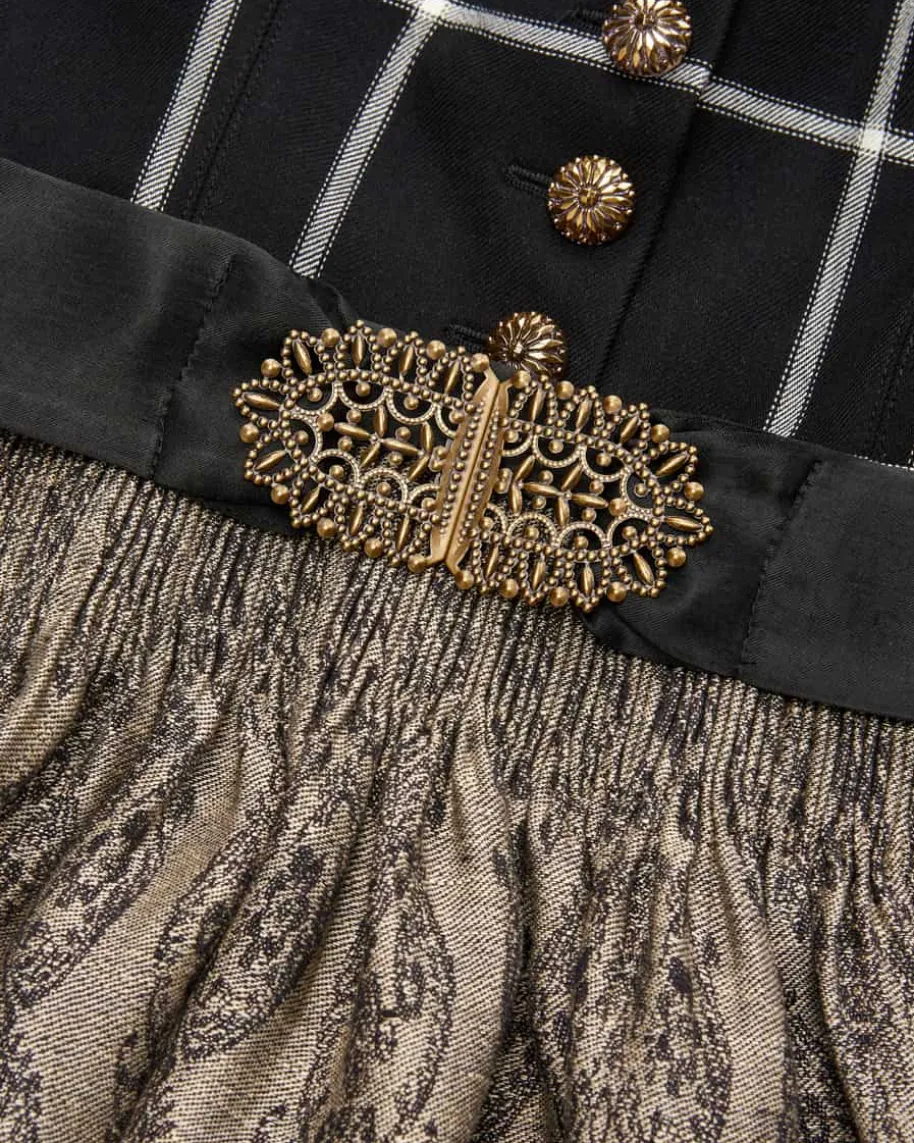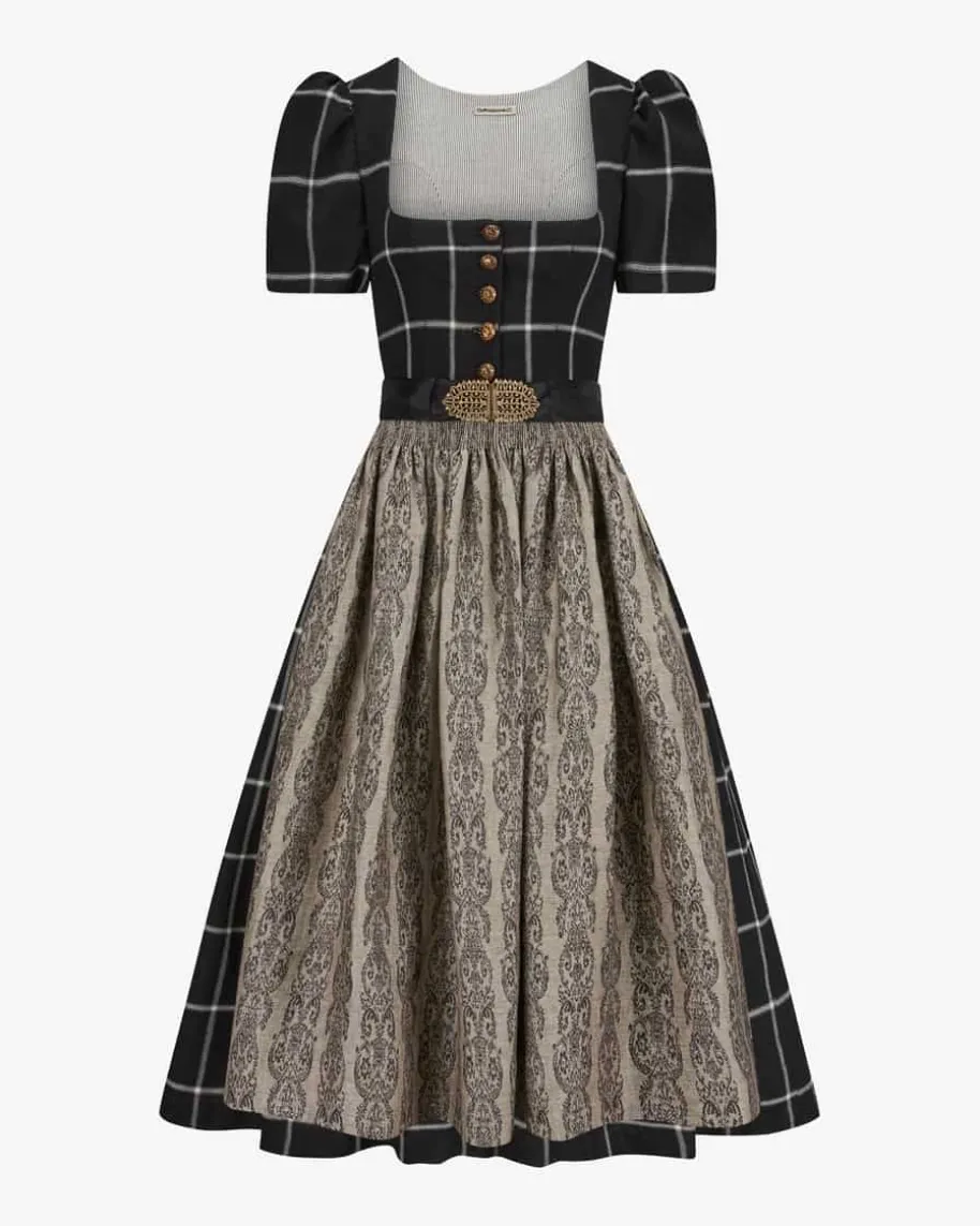 Lorle Dirndl lang mit Schürze für Damen von Gottseidank in Schwarz undElfenbein. Die Münchner Trachtenmarke verbindet klassische Dirndl und Janker mitklarer Ästhetik und hochwertigen Stoffen zu einer modernen Interpretationtraditioneller Mode. Auch dieses Modell erhält dank der dekorativen Knöpfe inKombination mit dem Karo-Muster einen traditionell-femininen Charme, während diePuffärmel den letzten Schliff verleihen. Die Leinen-Schürze mit eingewebtemOrnament-Muster rundet das feminine Gesamtbild harmonisch ab.