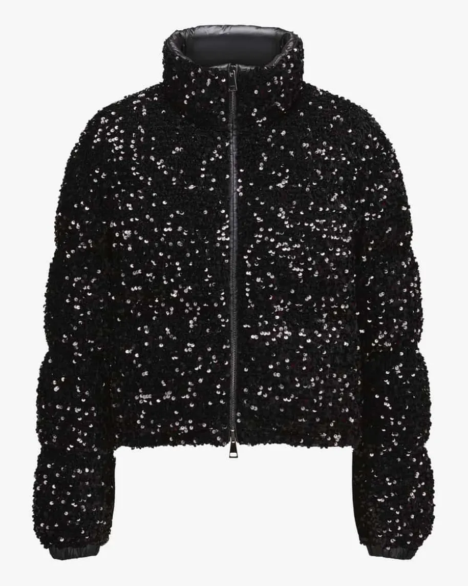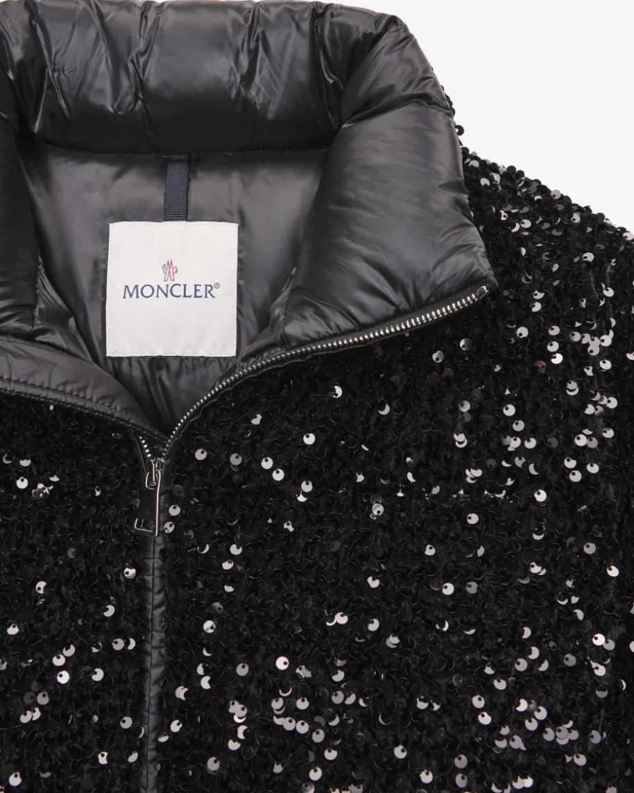 Louvi Pailletten-Daunenjacke für Damen von Moncler in Schwarz. Für hochwertigeDaunenjacken ist das italienische Label weltweit bekannt. Auch dieses Modell inverkürzter Bomberjacken-Silhouette verspricht dank der hochwertigen Daunen-Füllung eine optimale Wärmeisolierung, während das changierende Pailletten-Design einen femininen Charakter verleiht und so zu einem winterlichen Hinguckeravanciert.