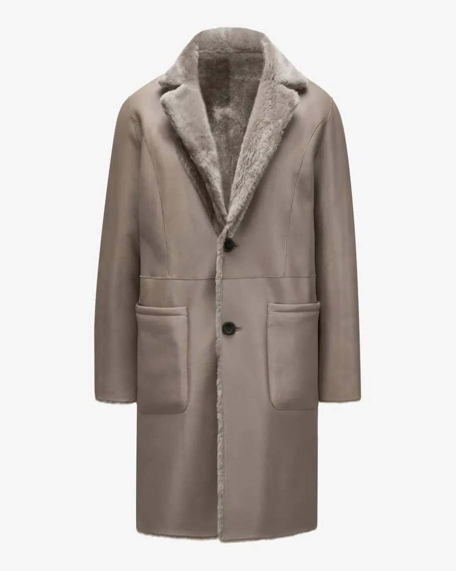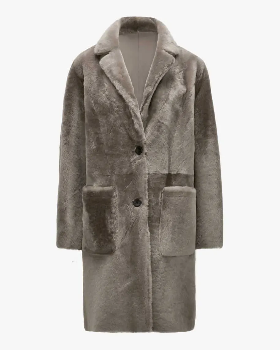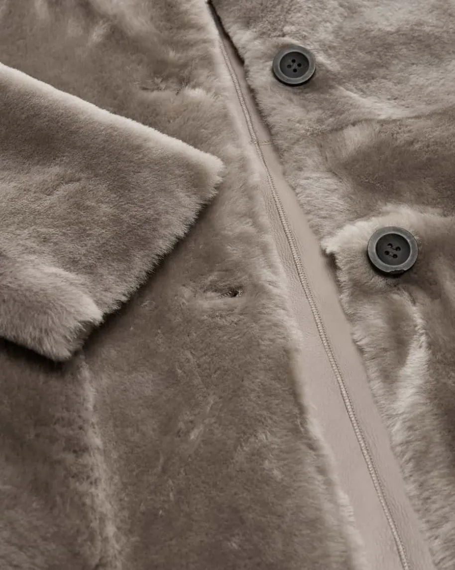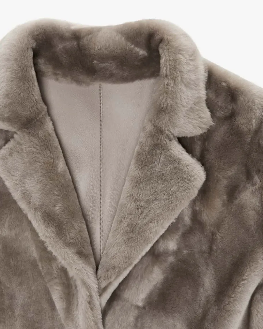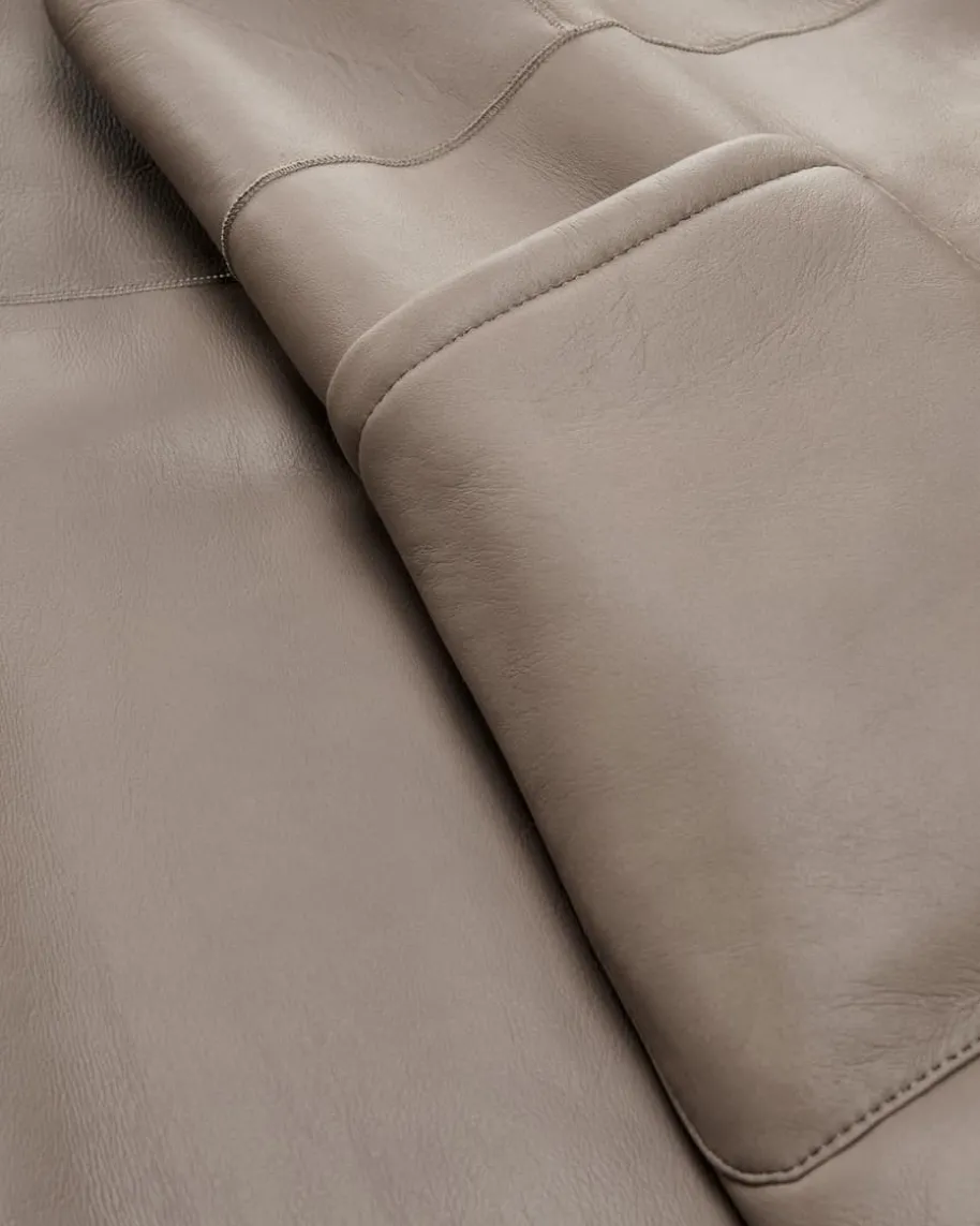 Luceram Wendemantel für Damen von Arma in Taupe. Das Modell begeistert mitseiner praktischen Wende-Funktion. Während die weiche Schaffell-Seite mitangenehmen Tragemomenten punktet, verleiht die Leder-Seite mit Ziernähten demGesamtbild eine edle Note.