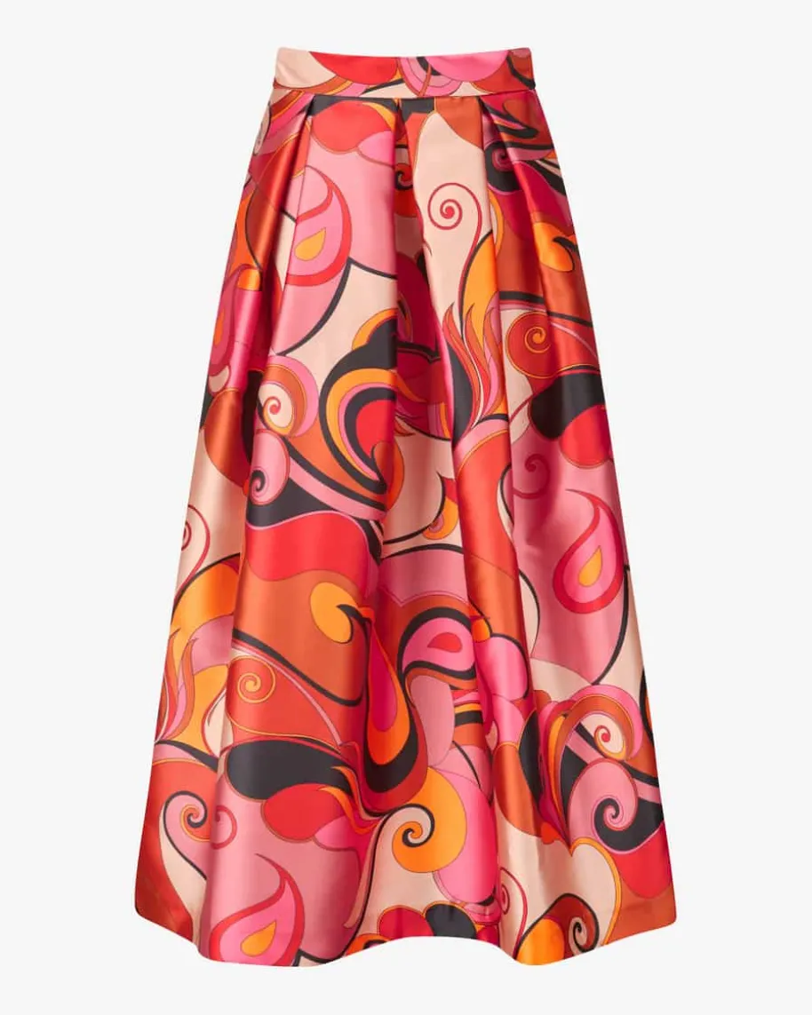 Luna K Groovy Rock für Damen von Lunatica Milano in Orange, Rot und Schwarz. DasModell präsentiert sich mit extravagantem Allover-Print mit abstraktem Pucci-Muster, wobei die A-Linie und die markanten Kellerfalten einen Look schaffen,der aus jedem Outfit einen Hingucker macht.