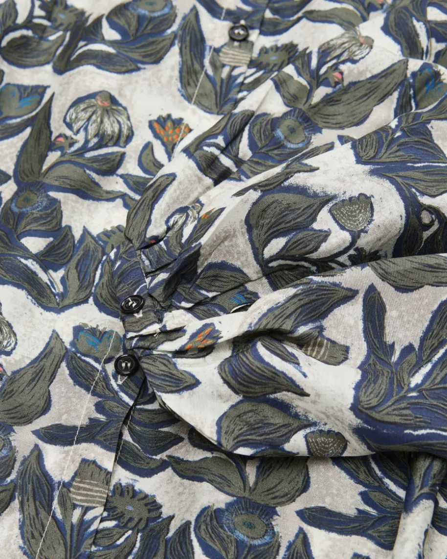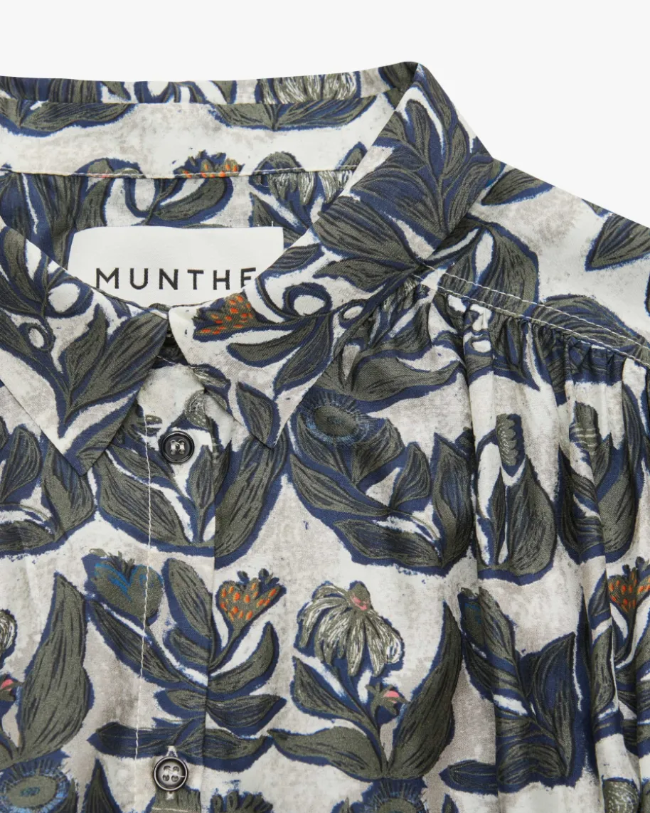 Lynx Bluse für Damen von Munthe in Oliv, Creme und Dunkelblau. Dasskandinavische Label aus Kopenhagen – feminin & cool. Auch dieses weite Modellmit floralem Print besticht dank fließendem Viskose-Seide-Mix mit fließendemTragekomfort, während feminine Raffungen an der Schulter das stilvolleGesamtbild gekonnt abrunden.