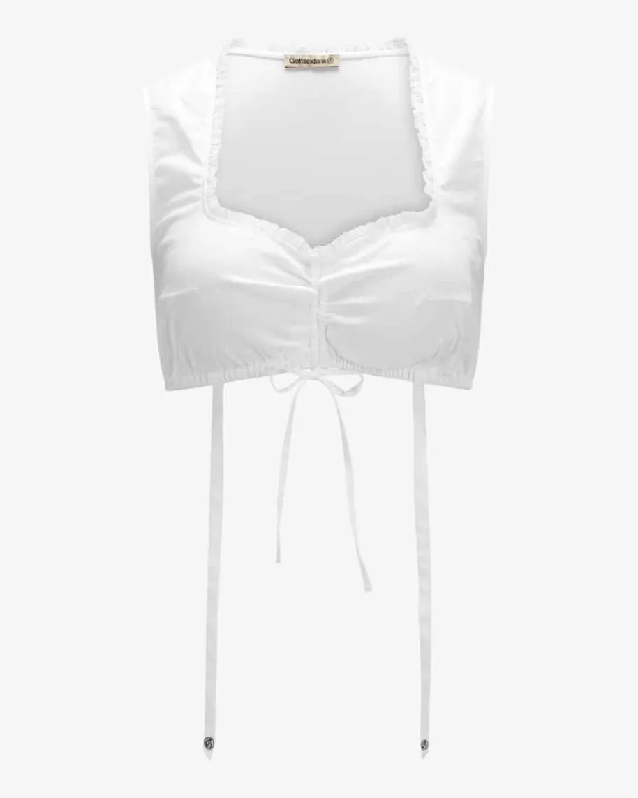 Maresa Dirndlbluse für Damen von Gottseidank in Weiß. Der hochwertige Baumwoll-Leinen-Mix sorgt für eine angenehme Haptik, während feine Paspelierungen denDirndlbegleiter gekonnt ergänzen.