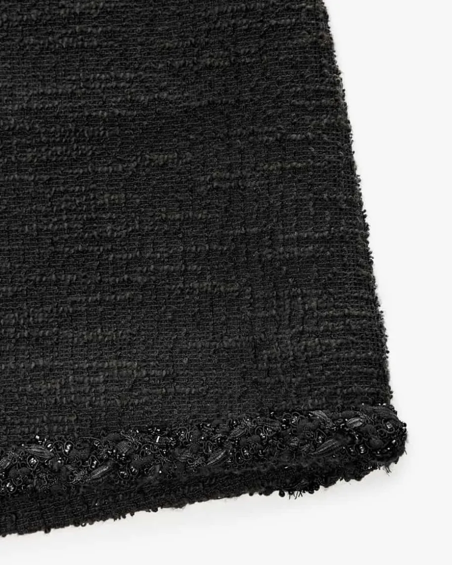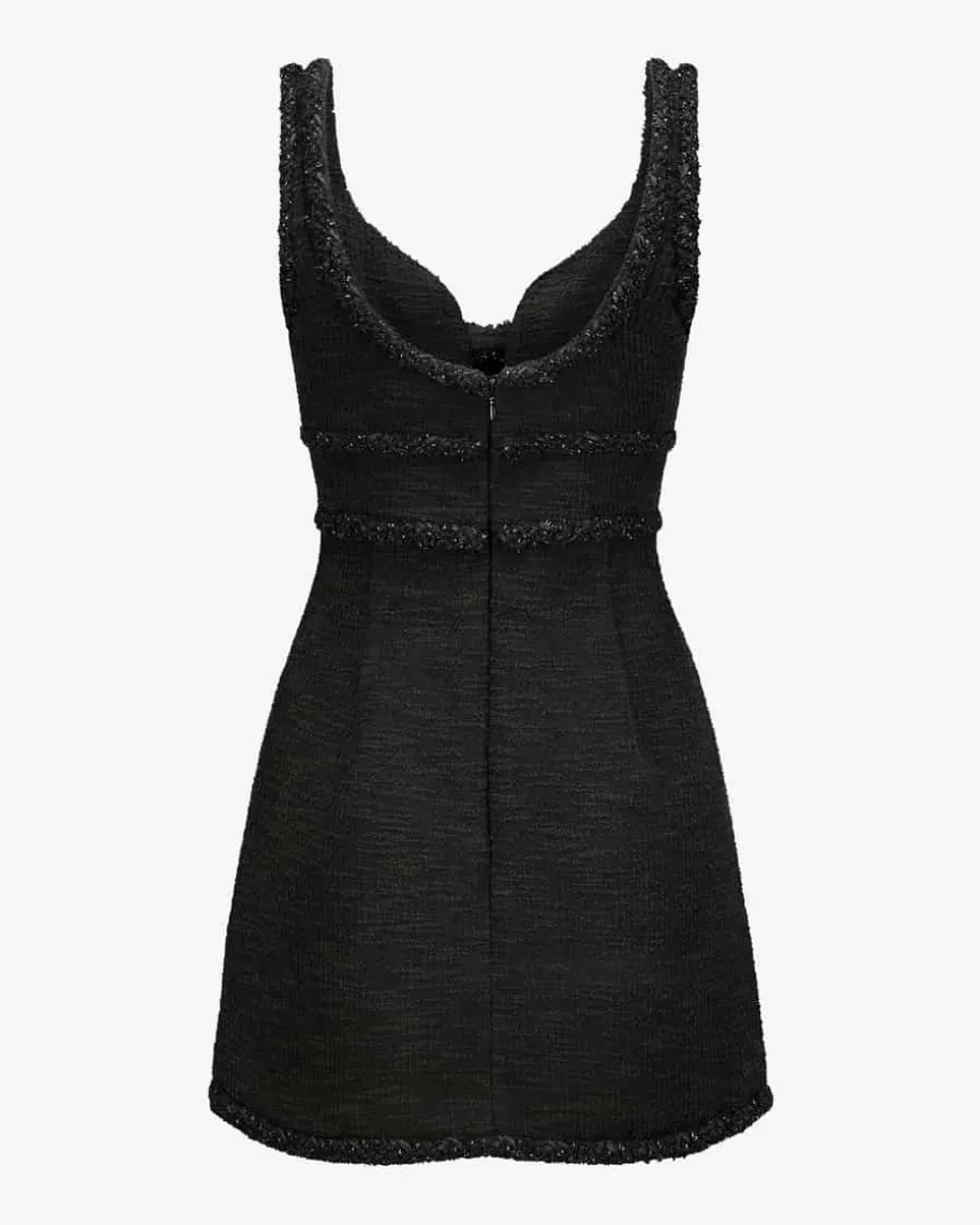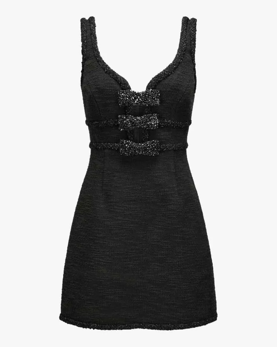 Margo Kleid für Damen von Rebecca Vallance in Schwarz. Das kleine Schwarze mitbesonderem Twist – Das feminine Design besticht in klassisch-eleganter Bouclé-Aufmachung, während die changierenden Schmuckstein-Applikationen zusammen mitden aufgesetzten Schleifen ein extravagantes Finish verleihen.