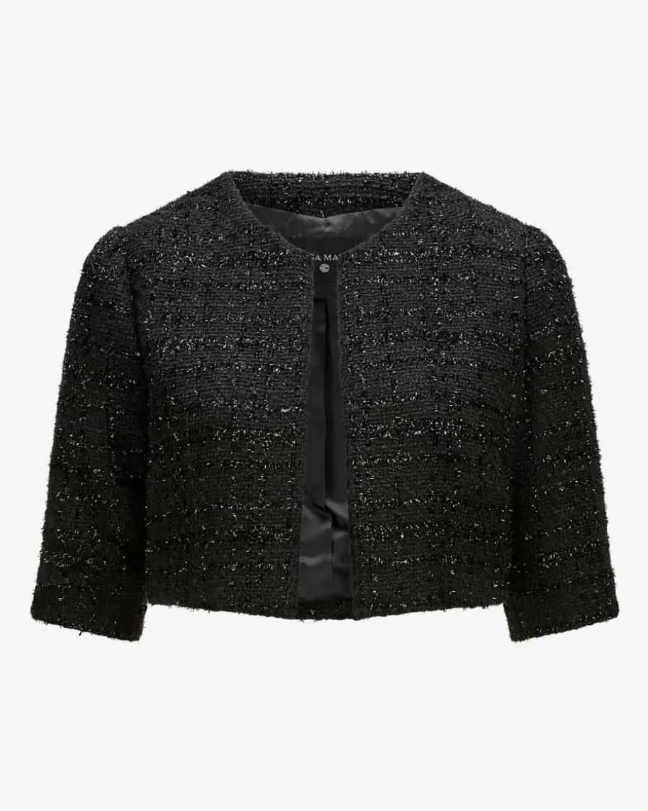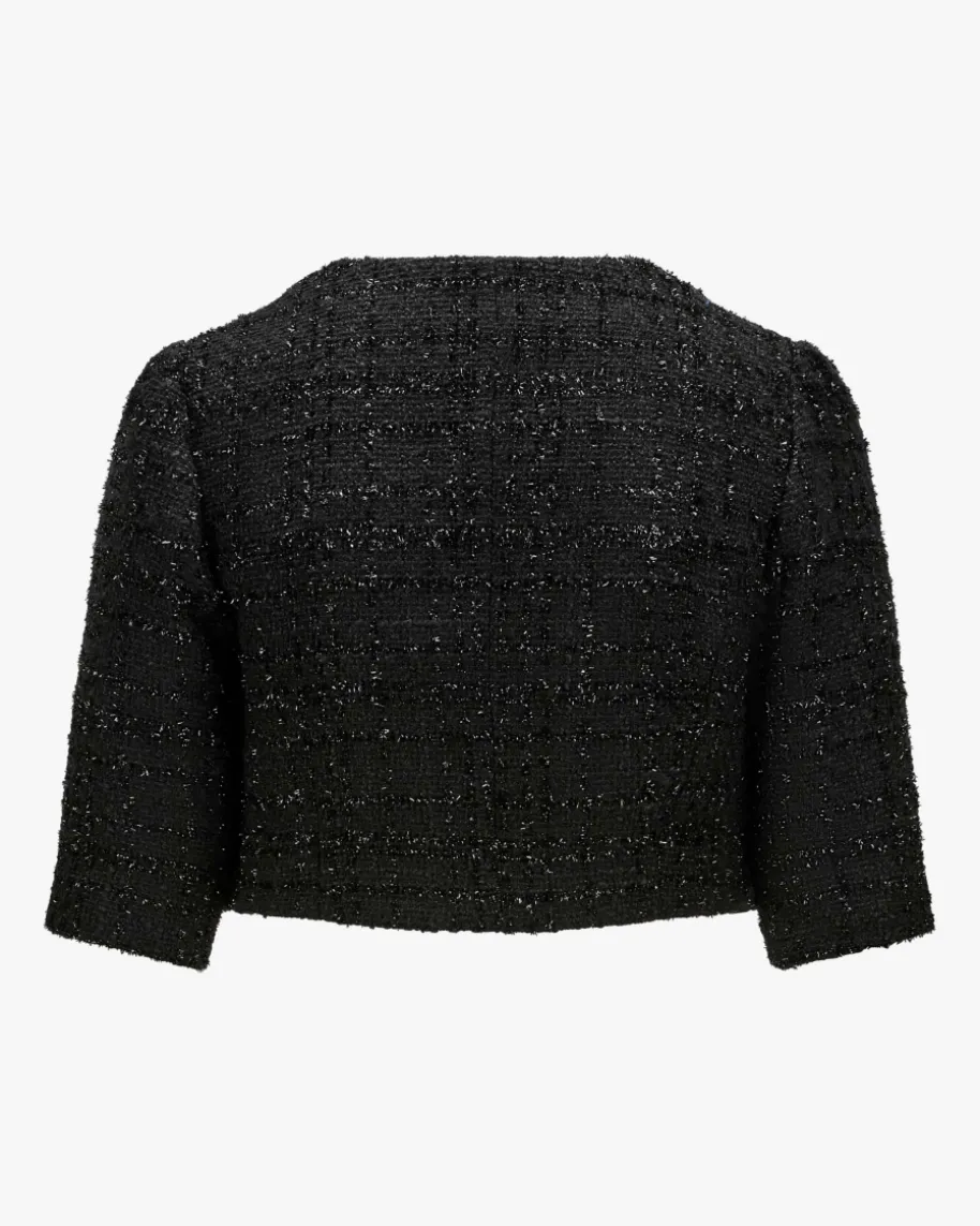 Marie Trachtenbolero für Damen von Kinga Mathe in Schwarz. Das Modell überzeugtdank edel changierender Bouclé-Aufmachung und verkürzter Silhouette – einmodischer Style für vielseitige Trachten-Looks mit dem gewissen Etwas.