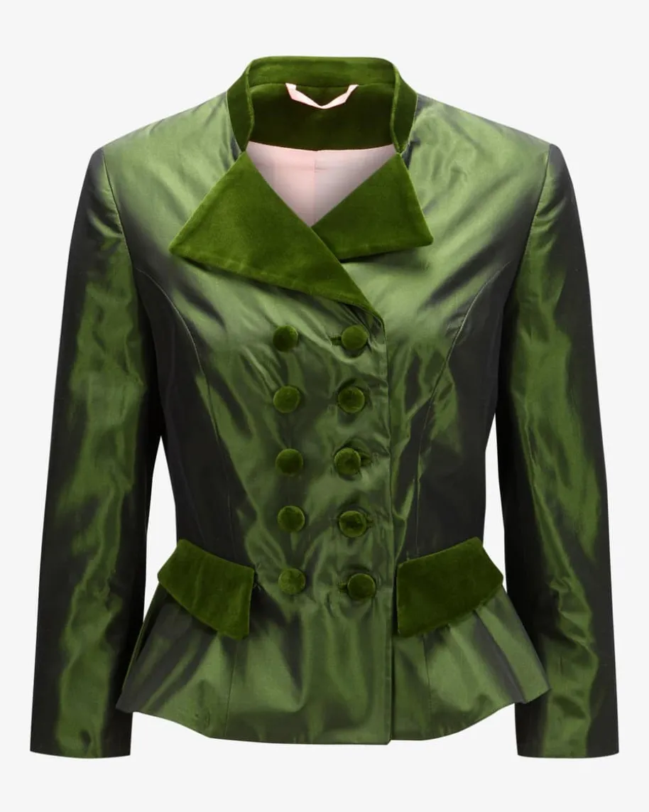 Marie-Valerie Trachtenblazer für Damen von Stajan in Grün. Made in Austria –Aus hochwertiger Seiden-Qualität gefertigt, präsentiert sich das taillierteModell dank kontrastierendem Innenfutter, doppelreihiger Knopfleiste sowie desklassischen Designs in traditionell-authentischer Aufmachung. Zugleich rundendas Schößchen sowie edle Samt-Partien den Trachten-Look feminin ab.