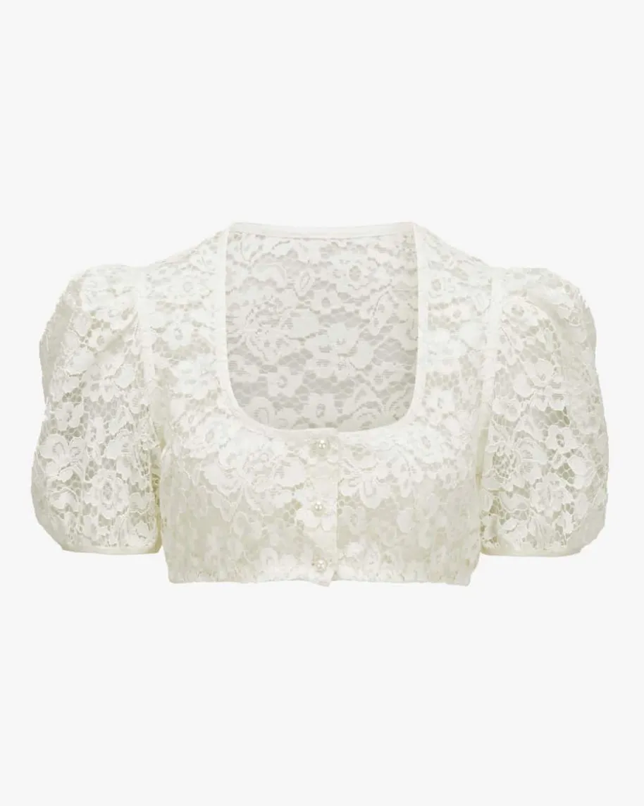 Mariella Dirndlbluse für Damen von Nicoletta Giacomelli in Creme. Das Modellbegeistert mit tiefem Rundhals-Ausschnitt und zarten Puffärmeln und avanciert sozum stilvollen Begleiter für Ihren Trachten-Look. Zugleich verleiht die feineSpitzen-Verarbeitung angenehme Tragemomente.