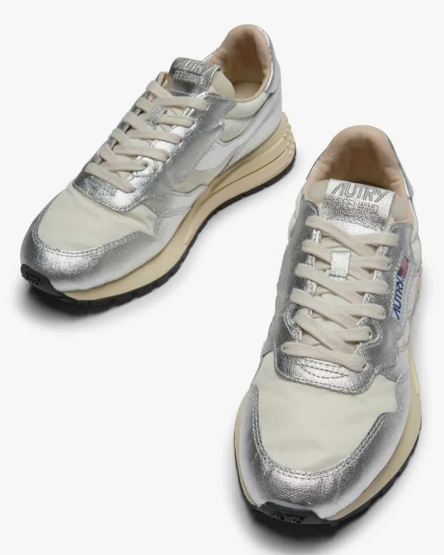 Metallic Reelwind Low Sneaker für Damen von Autry in Silber und Off-White. Das1982 in Dallas gegründete Label etablierte sich zu einem der beliebtestenSneaker-Marken der 1980er Jahre und feierte 2019 sein Comeback. Für diesesModell ließ sich die Marke von dem dynamischen Design der Runner inspirieren undverbindet fließend die Innovation von Performance-Schuhen mit der Ästhetik der80er Jahre. Der aus genarbtem Leder und glattem Textil gefertigte Reelwind isteine außergewöhnliche Kombination aus Stil und Funktionalität.