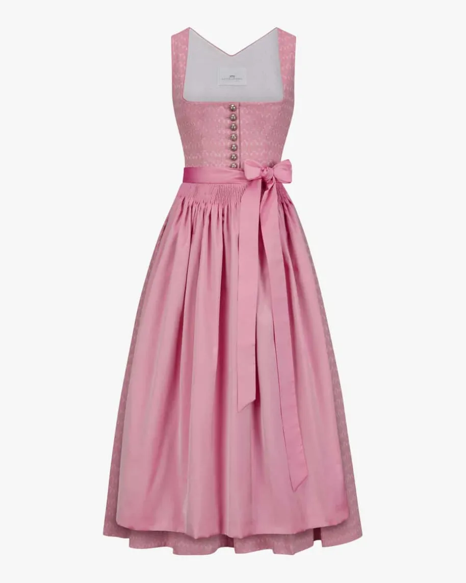 Midi-Dirndl mit Schürze für Damen von LODENFREY München 1842 in Pink, Rosa undBeige. Jahrelange Erfahrung, hochwertige Verarbeitung und viel Liebe zumDetail zeichnen die exklusiven Kreationen aus unserem Hause aus. Das Modellbesticht durch seine hochwertige Qualität in Ornamenten Allover-Dessin, währenddie silberfarbenen Kugelknöpfe und die changierende Schürze das Gesamtbildharmonisch abrunden.