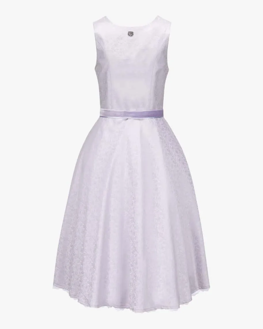 Midi-Dirndl mit Seidenschürze für Damen von Edelweiß in Lavendel und Silber. DasModell begeistert mit feiner Jacquard-Verarbeitung und traditionellen Details.Die semitransparente Mesh-Schürze mit floralen und filigranen Stickereien sowieder Samt-Besatz rundet den Trachten-Look feminin ab.