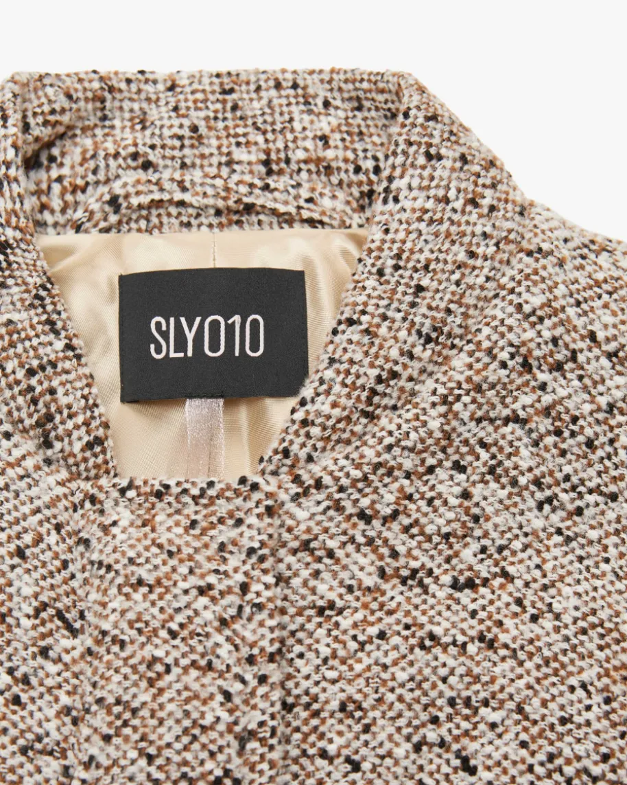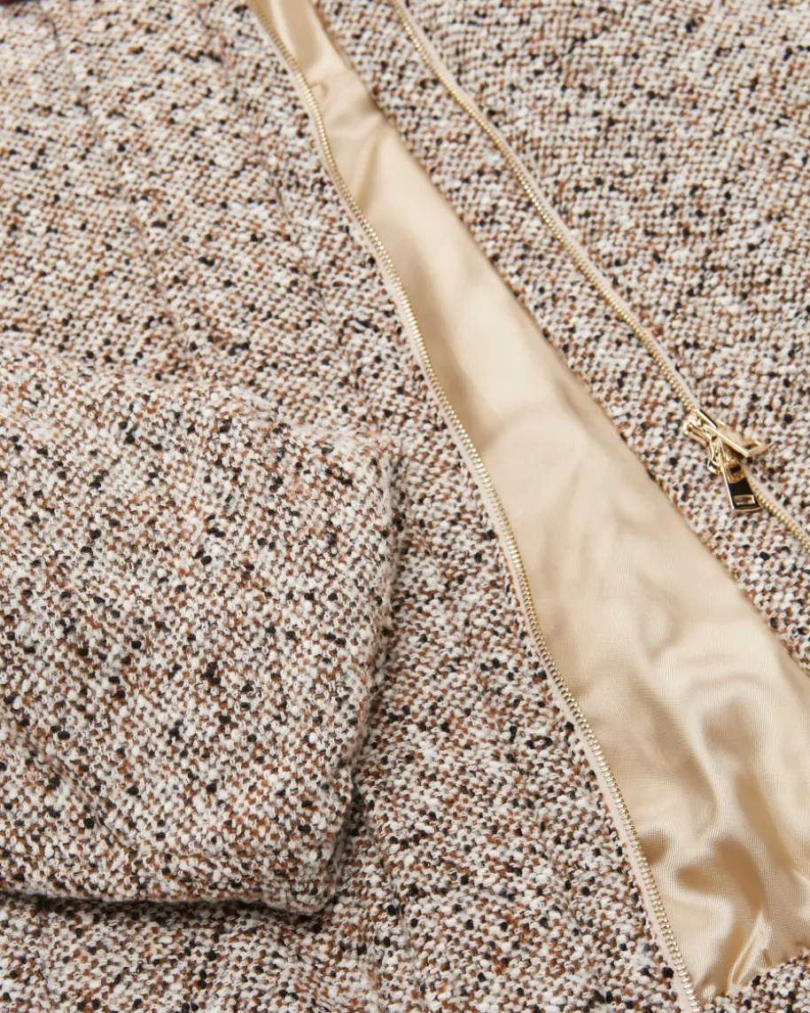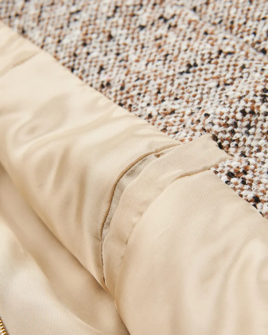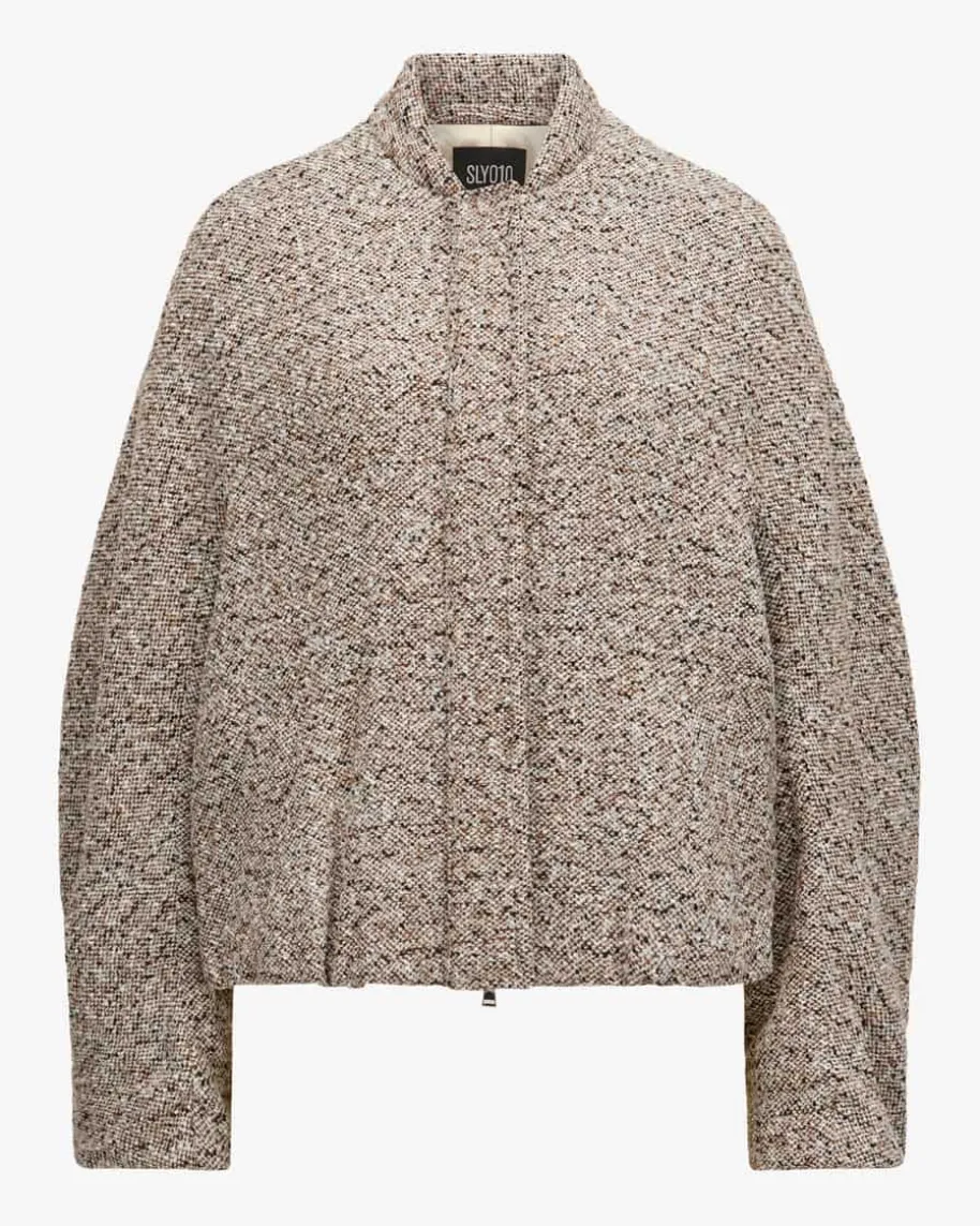 Milea Woll-Bomberjacke für Damen von SLY010 in Weiß, Hellbraun und Schwarz. Dasgefütterte Modell zeichnet sich durch die hochwertige Woll-Cashmere-Qualität inBouclé-Optik aus, während die weite Bomberjacken-Silhouette einen modischenBegleiter für kühlere Tage kreiert.