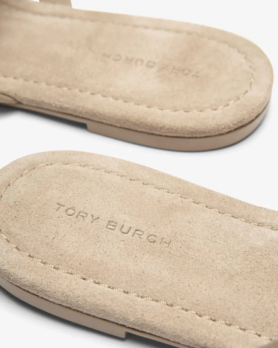 Miller Zehentrenner-Sandalen für Damen von Tory Burch in Taupe. Dank derhochwertigen Veloursleder-Qualität wird ein edler, zeitloser Sommer-Lookgeschaffen, während das markante Logo-Detail besondere Akzente setzt.