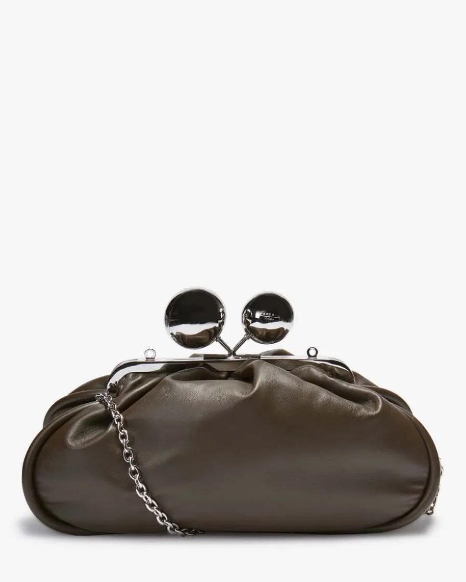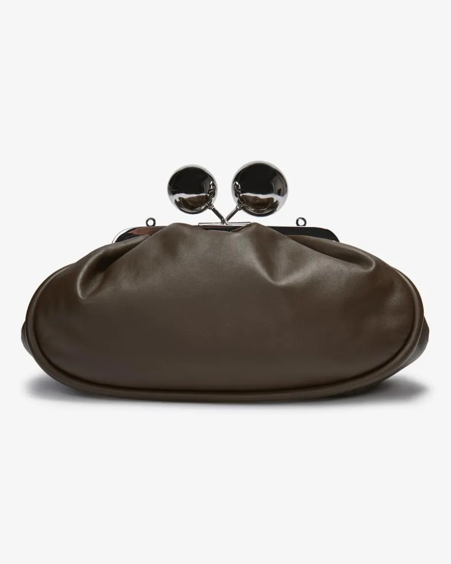 Milvanew Umhängetasche für Damen von Weekend Max Mara inKhaki und Silber. Diemittelgroße Pasticcino Bag aus glänzendem Nappaleder isteine Super-Clutch, diedeinem Alltagslook eine persönliche und faszinierende Noteverleiht. DerMetallverschluss mit großen Weekend Max Mara Kugeln setztzudemcharakteristische Akzente
