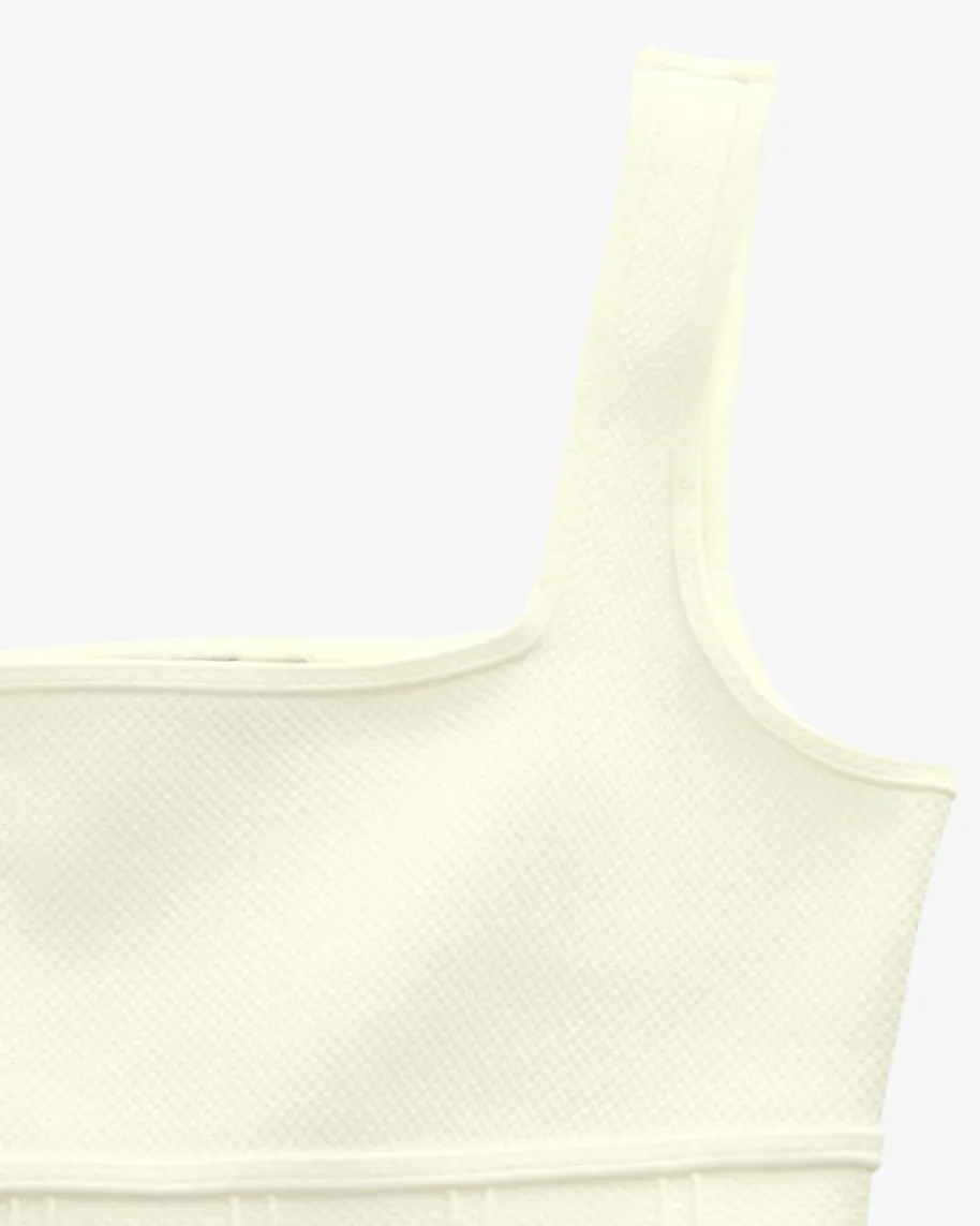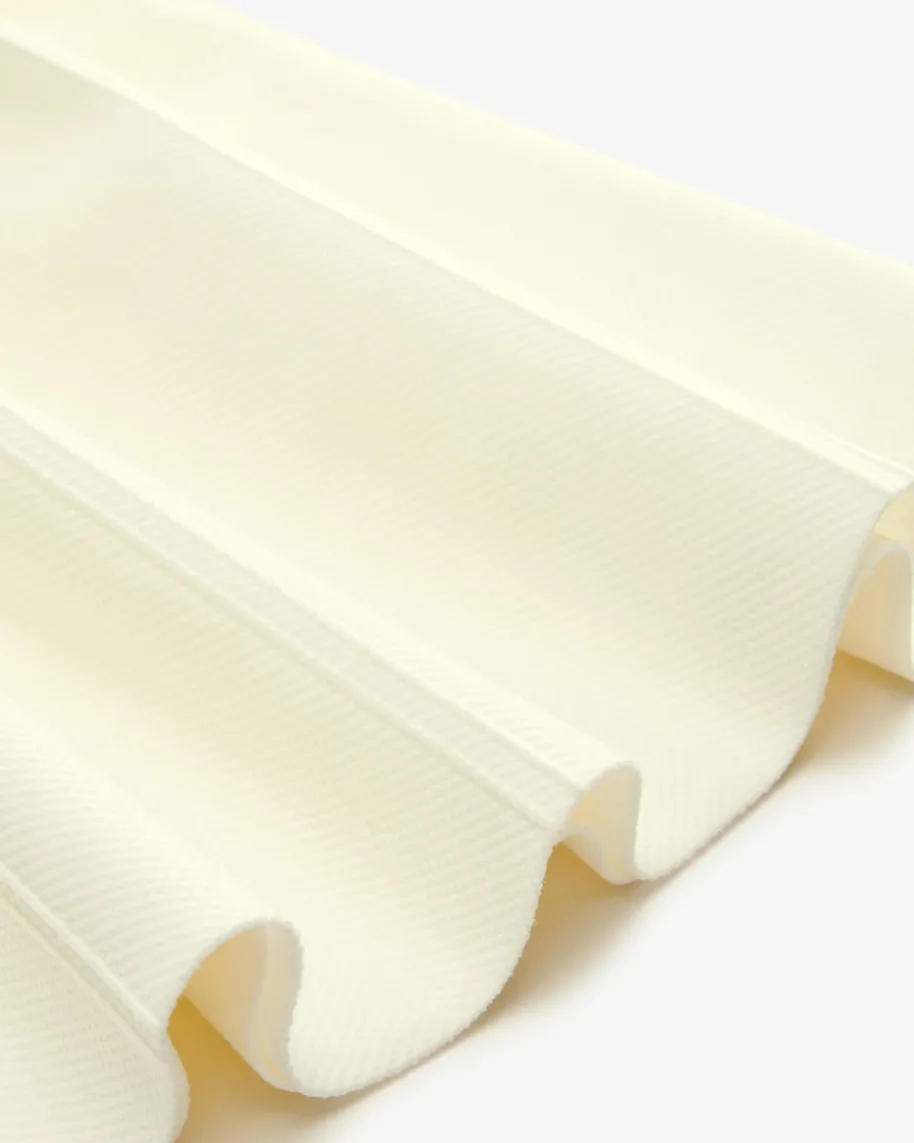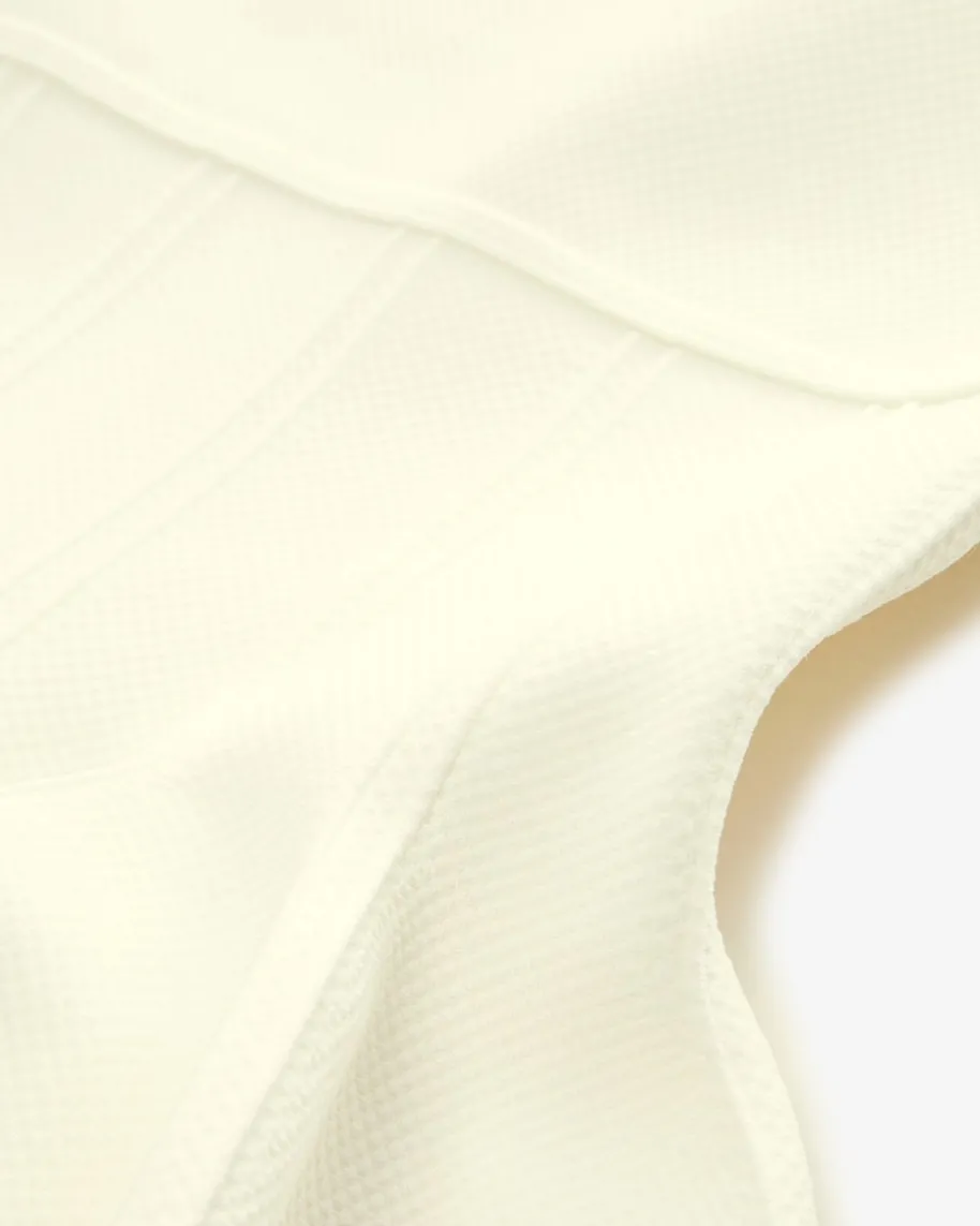 Minikleid für Damen von Simkhai in Ecru. Das taillierte Kleid begeistert dankdes weit ausgestellten Bahnenrocks, während die feine Struktur in Strick-Optikauf der elastischen Material-Verarbeitung einen femininen Eyecatcher kreieren.