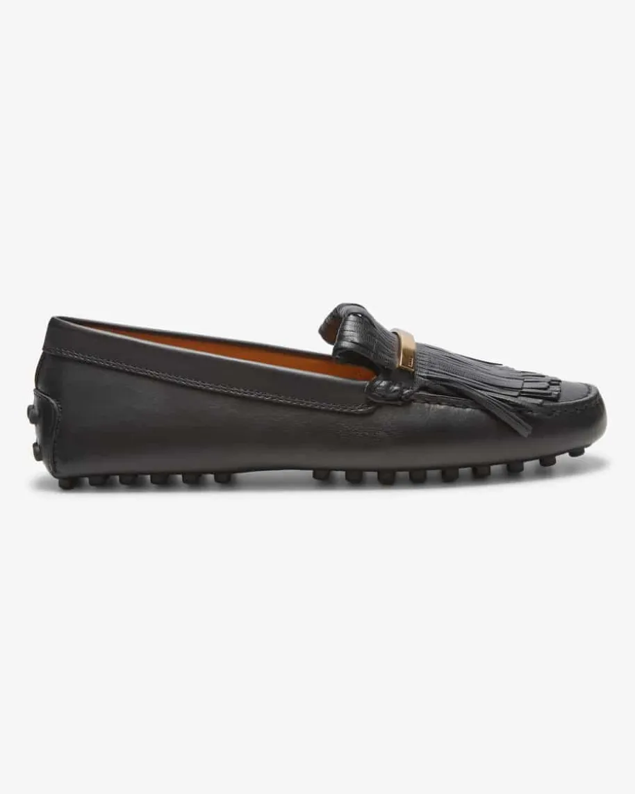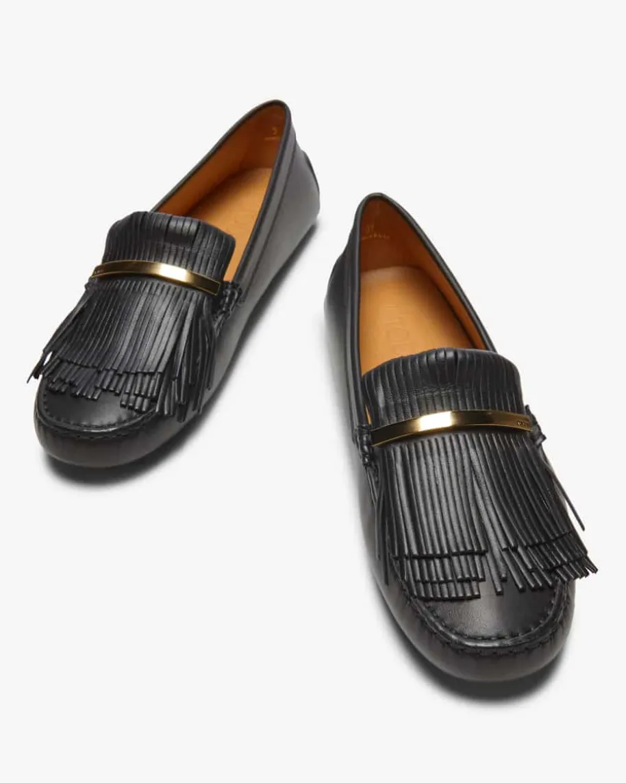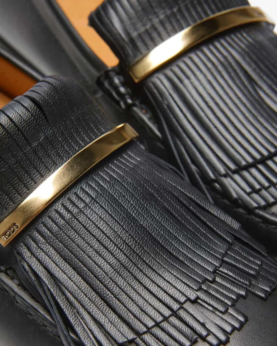 Mokassins für Damen von Tod’s in Schwarz. Seit über 100 Jahren prägt Tod’s mitseinem exklusiven Stil und italienischen Flair die Damen- und Herrenmode. DiesesModell überzeugt mit hochwertiger Glattleder-Verarbeitung sowie derlabeltypischen Noppen-Details und wird dank der Fransen-Details zum perfektenFavoriten für Equestrian-Looks.