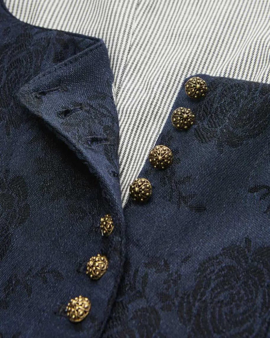 Monika Dirndl lang mit Schürze für Damen von Gottseidank in Navy und Oliv. Dankdes floralen Musters erhält der Artikel einen traditionell-femininen Charme,während klassische Details den letzten Schliff verleihen. Die schlichte Schürzerundet das Gesamtbild harmonisch ab.