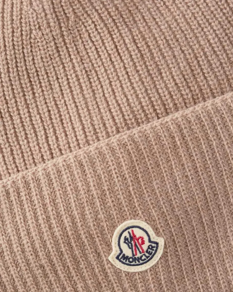 Mütze für Damen von Moncler in Sand. Das Modell punktet dank der Schurwoll-Verarbeitung in Rippstrick-Qualität mit einem besonders weichen Griff, währenddas schlichte Design mit Logo-Applikation ein vielseitiges Accessoire kreiert.