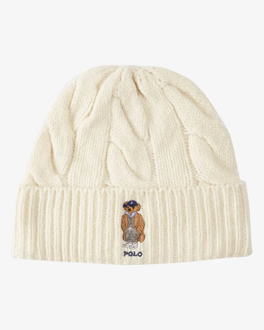 Mütze für Damen von Polo Ralph Lauren in Off-White. Das Modell aus hochwertigemWoll-Mix begeistert in klassischer Beanie-Aufmachung, während das Zopfstrick-Muster mit detailverliebter Polobären-Stickerei einen modernen Begleiter fürkühle Tage kreiert.