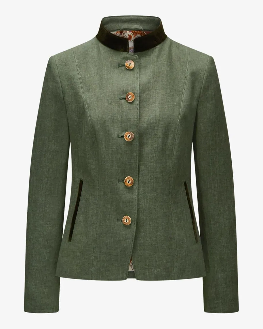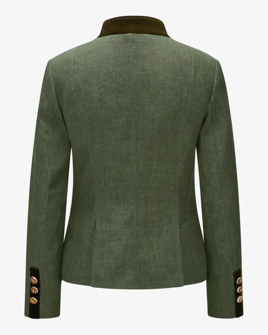 Natalie Trachtenblazer für Damen von Meindl in Tanne. Das traditionelleModell überzeugt durch zeitlose Eleganz in hochwertiger Leinen Qualität. EdleSamt-Paspelierungen, Hornknöpfe und die rückseitigen Gehschlitze runden dasGesamtbild harmonisch ab.