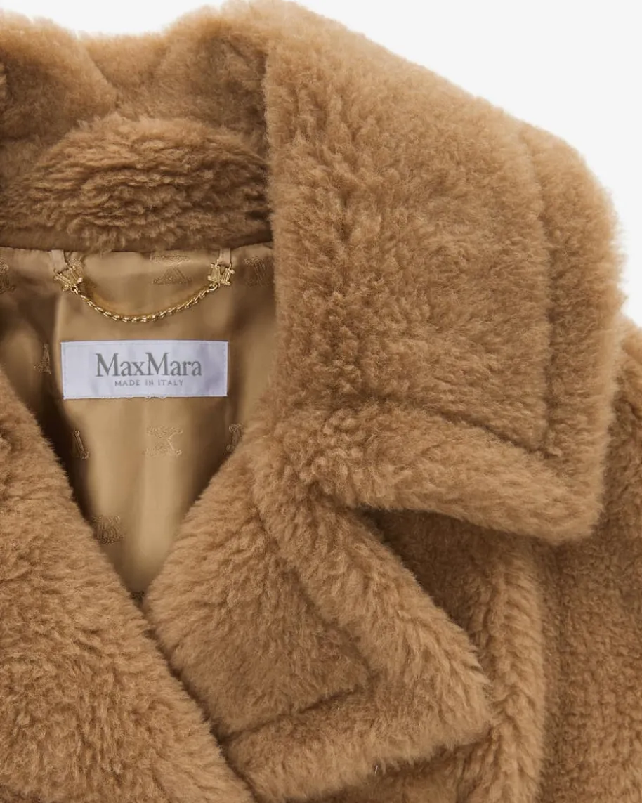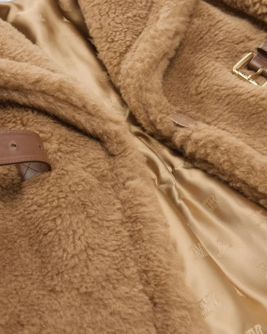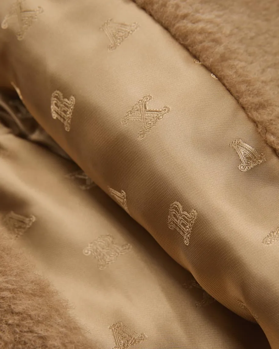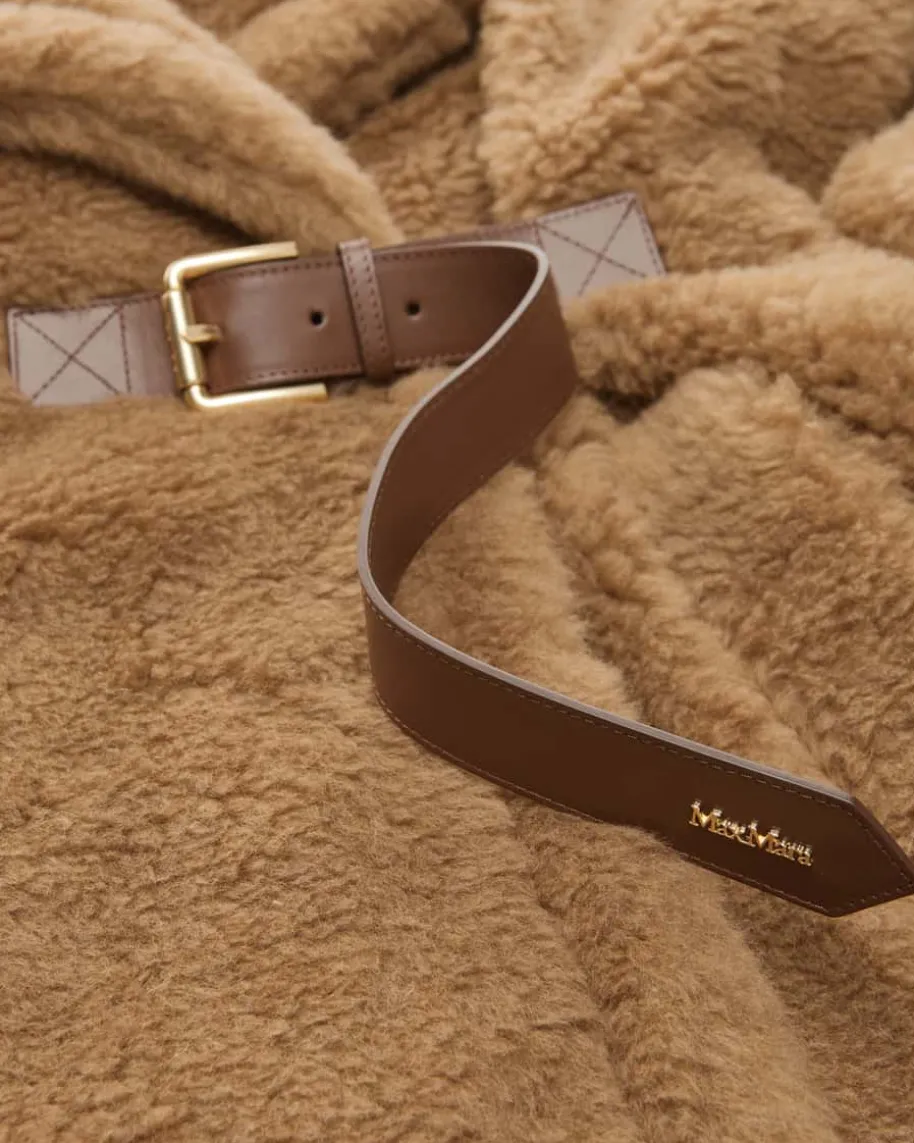 New Abavo Cape für Damen von Max Mara in Camel. Eine elegante Jacken-Alternative- Das Modell punktet dank hochwertigem Kamelwolle-Seiden-Mix in stilvollerTeddyfell-Optik, während die elastischen Einsätze an der Taille sowie derintegrierte Ledergürtel eine feminine Silhouette zaubern.