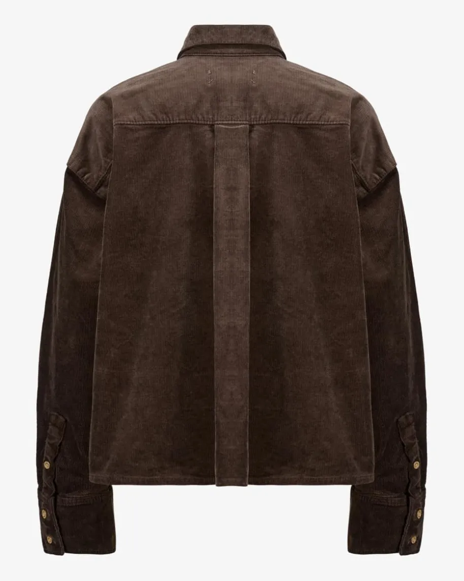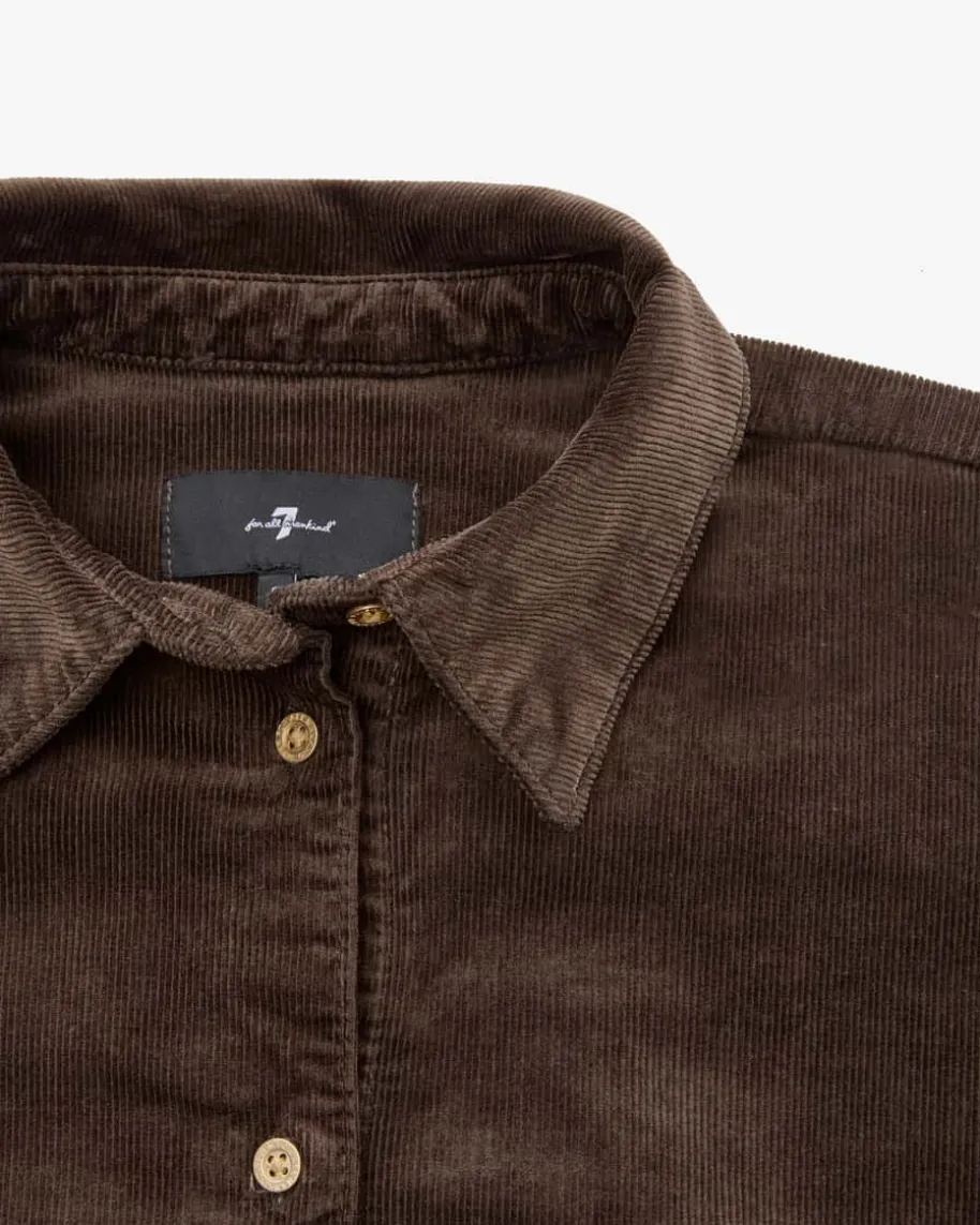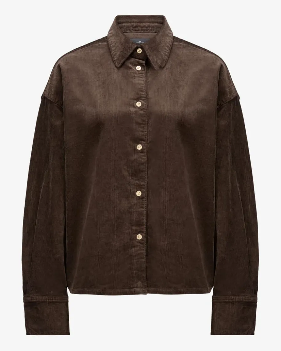 Nina Cord-Hemdbluse Cropped für Damen von 7 For All Mankind in Schoko. DasModell präsentiert sich dank der feinen Cord-Qualität als komfortabler undmoderner Favorit, welcher durch die verkürzte Oversize-Silhouette einen legerenCharakter erhält. Goldfarbene Logo-Knöpfe runden den Look labeltypisch ab.