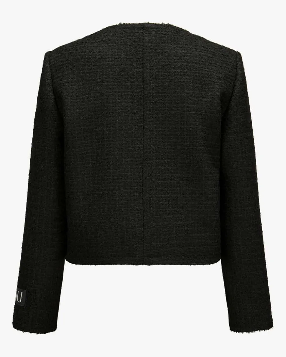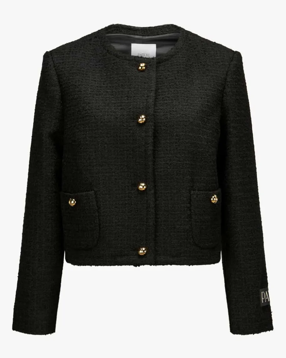 No Collar Boxy Blazer für Damen von Patou in Schwarz. Das Modell in Bouclé-Aufmachung überzeugt in hochwertiger Schurwoll-Qualität, während die klassischenDetails in Kombination mit den markanten Knöpfen und der Logo-Applikation einenmodischen Look kreieren.