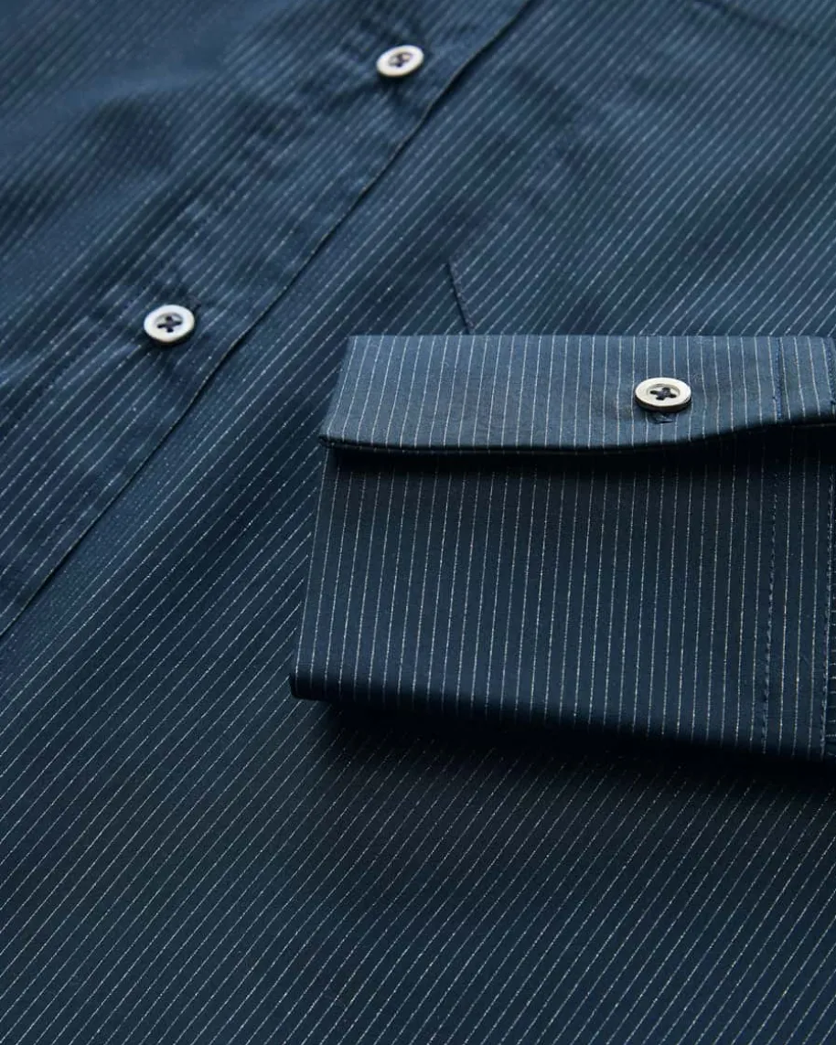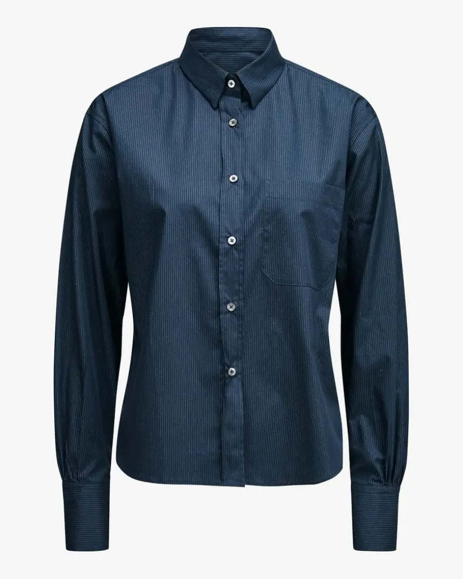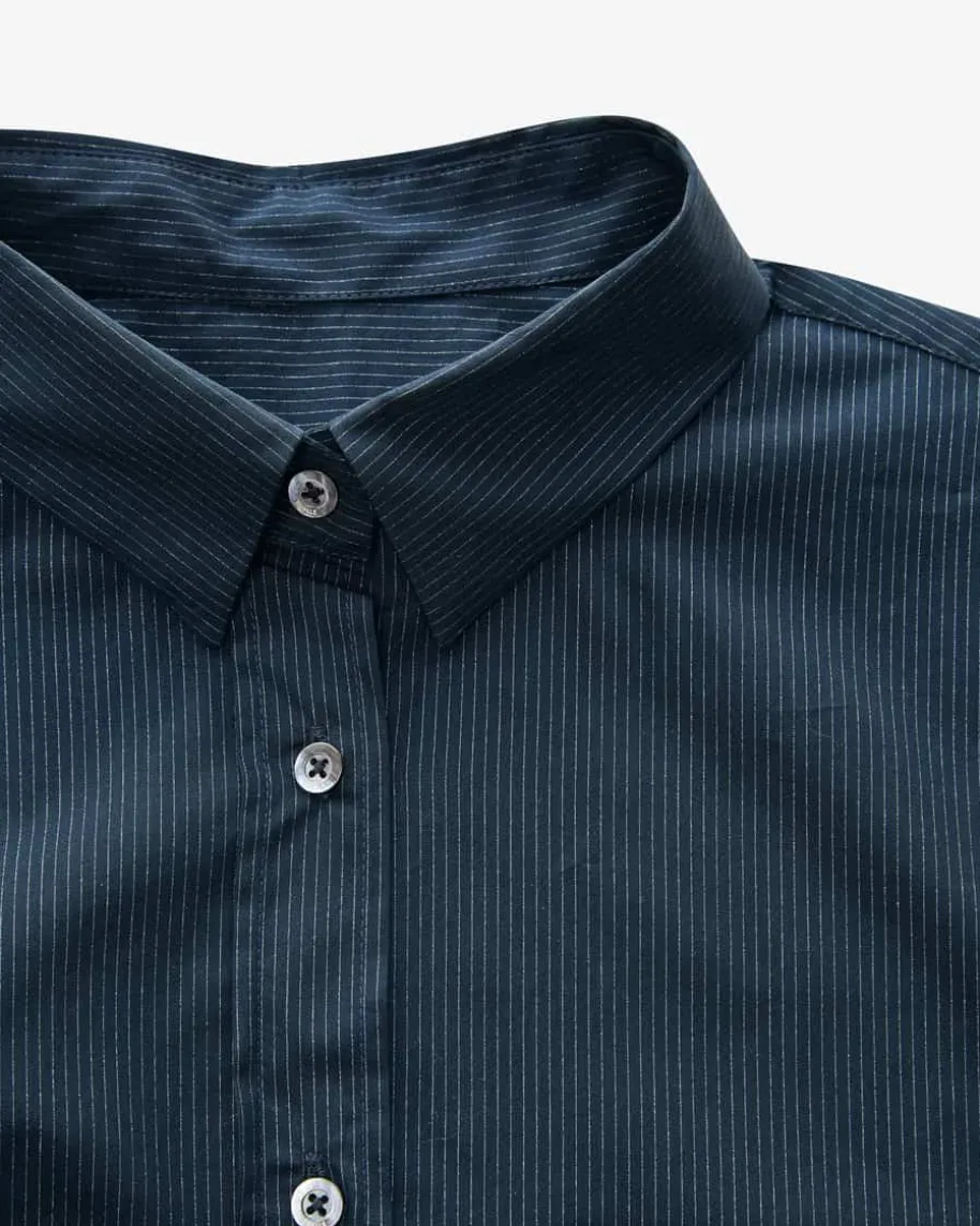 Noel Hemdbluse für Damen von Edelle in Marine und Silber. Das Modell in glatterBaumwoll-Qualität besticht dank der weiten Passform mit verlängerter Rückseiteals modischer und angenehmer Favorit, während die feinen Glitzerstreifen-stilvolle Akzente setzen.