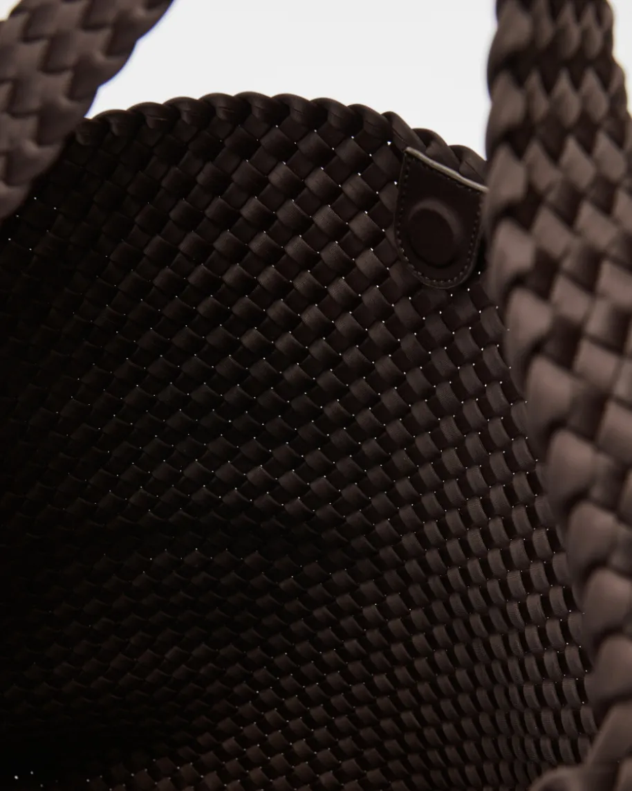 Nomad Large Hobo Henkeltasche für Damen von Naghedi in Schoko. Dieses textileModell präsentiert sich in dezent changierender Optik und edler Flecht-Aufmachung, während das XL-Design extraviel Stauraum schafft. Die separateClutch ist mit einem Reißverschluss versehen und bietet Platz für IhreKosmetikartikel oder andere Kleinigkeiten.