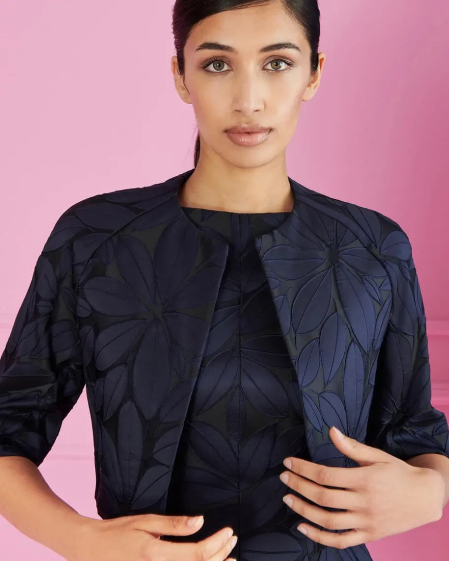 Nununu1 Blazer für Damen von Talbot Runhof in Navy und Schwarz. Das verkürzteModell aus edlem Leaf-Flower-Jacquard ist der perfekte Begleiter für ihre Abend-Garderobe. Die feminine Silhouette wird abgerundet durch die kurzen Ärmel undkann vielseitig kombiniert werden.