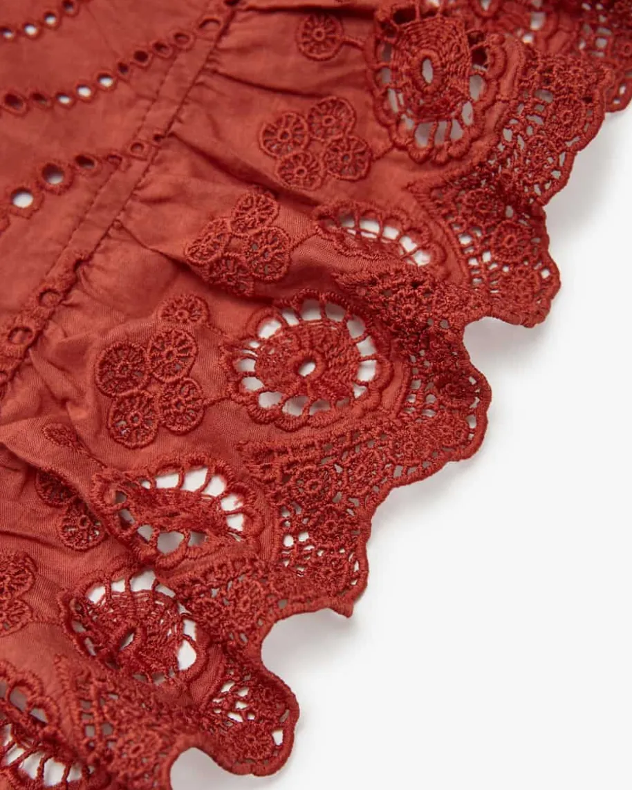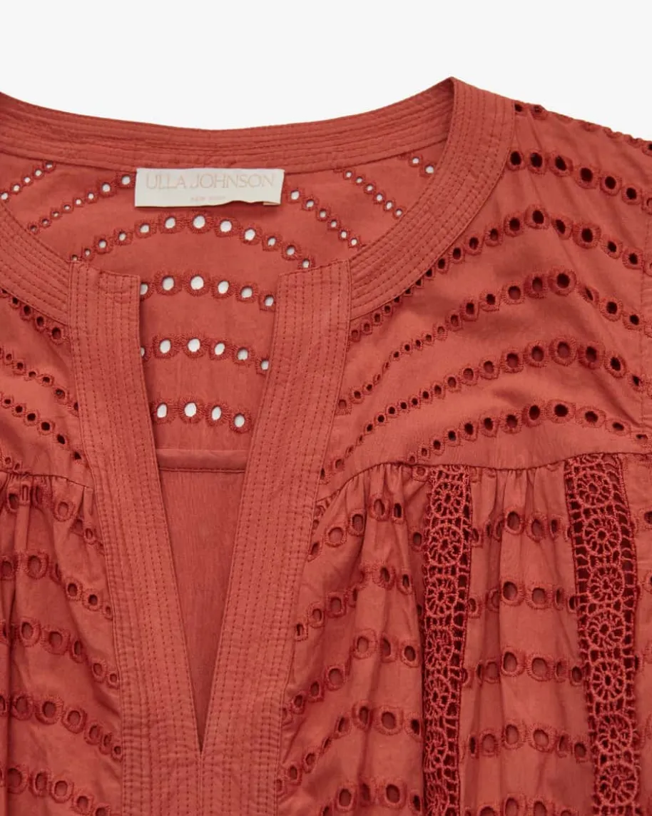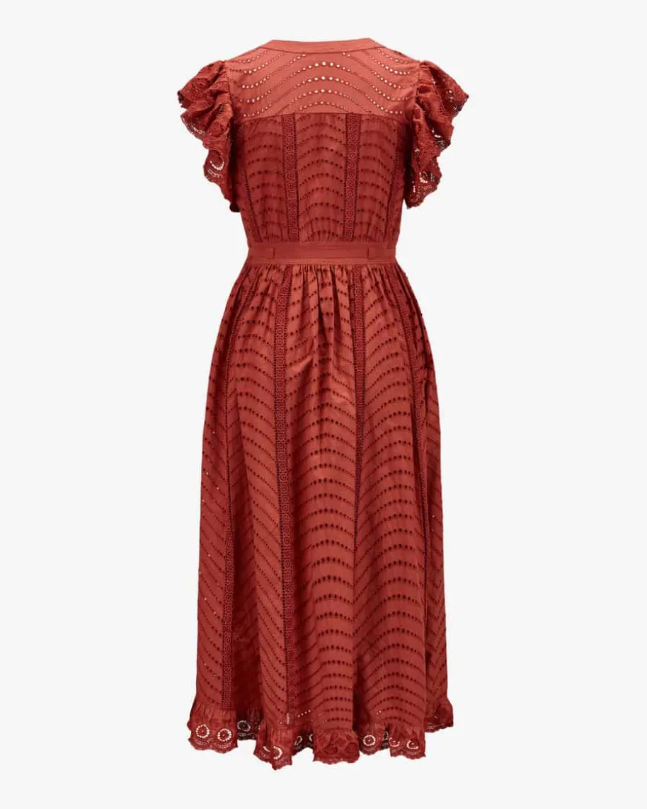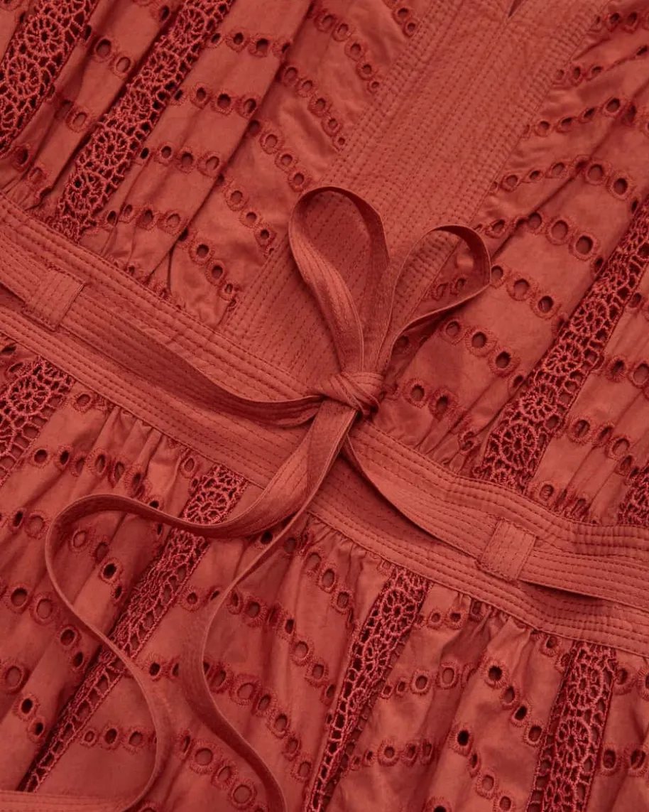 Olga Spitzenkleid für Damen von Ulla Johnson in Rostrot. Die New YorkerDesignerin steht für Boho-Luxus mit femininen Volants, Stickereien undfließenden Stoffen. Auch dieses Modell präsentiert sich in romantischerAufmachung, während die semi-transparente Lochspitze mit feinem Wellenmuster imBoho-Look einen stilvollen Begleiter kreieren. Die taillierte Passform mitabnehmbaren Taillenband zaubert eine feminine Silhouette und rundet das Designharmonisch ab.