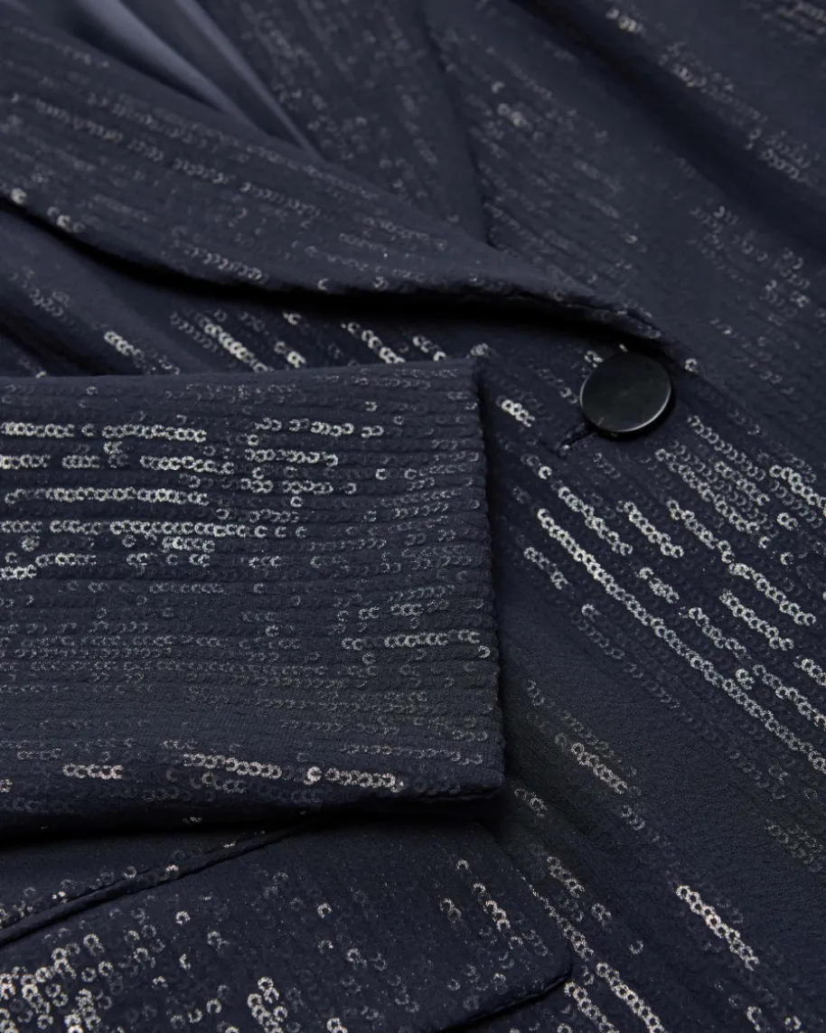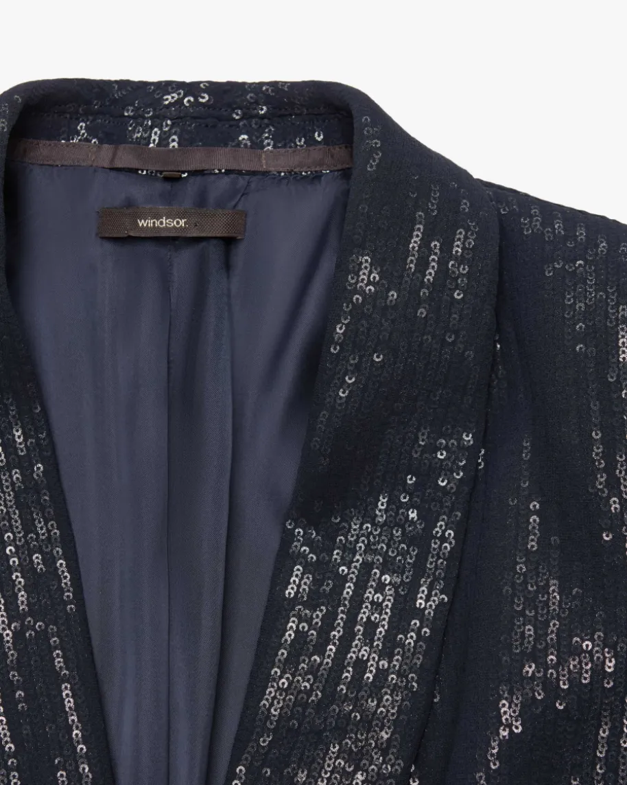 Paillettenblazer für Damen von Windsor in Navy. Das Schweizer Label steht fürelegante Businessmode und urbane Klassiker mit dezentem Luxusanspruch. Auchdieses Modell besticht dank klassisch-eleganten Details und taillierterSilhouette als femininer Begleiter, während die edel changierende Pailletten-Verarbeitung das Statement-Piece zum optischen Highlight avancieren lässt.