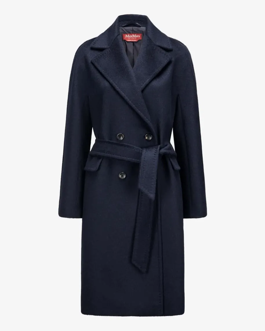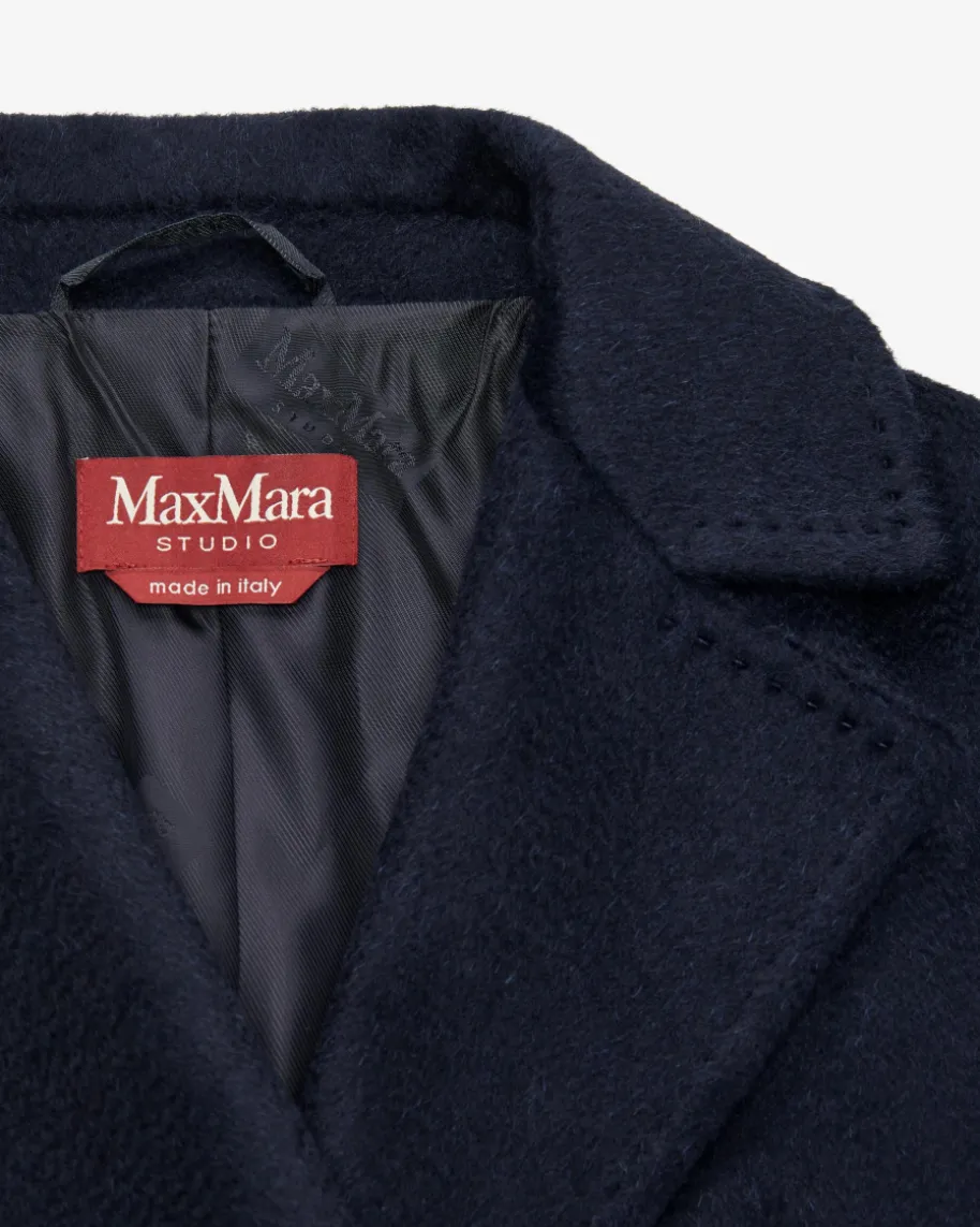 Panteon Cashmere-Wollmantel für Damen von Max Mara Studio in Navy. Weiblich,modern, tragbar – Max Maras femininere Linie. Auch dieses Modell in hochwertigemCashmere-Woll-Mix, überzeugt mit angenehmen Tragemomenten, während das Brushed-Cashmere-Design und der Drachenkeil-Einsatz einen besonderen Charakter verleiht.