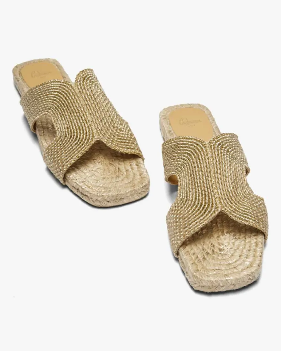 Pantoletten für Damen von Castaner in Natur und Gold. Das handgefertigte Modellavanciert durch die natürliche Material-Verarbeitung mit Metallic-Elementen zueinem besonderen Hingucker im Sommer, während die flache Sohle mit geflochtenemJute-Besatz und Lurex-Fasern sowie die eckige Form für den letzten Schliffsorgen.