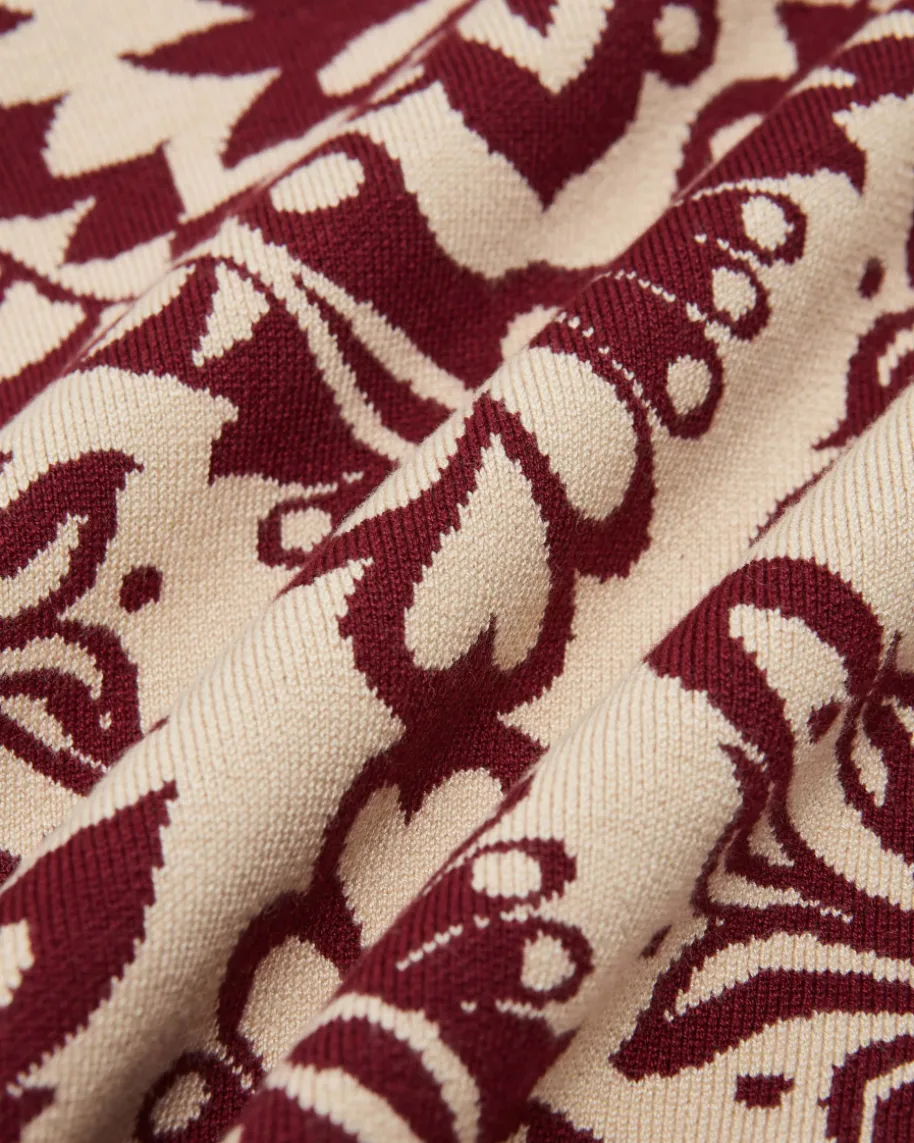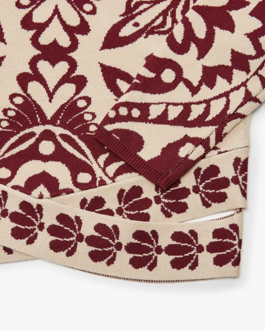 Pineapple Love Pullover für Damen von Farm Rio in Bordeaux und Sand.Brasilianische Marke voller Farben, Prints und Lebensfreude. Inspiriert vomtropischen Lebensgefühl bringt sie positive Energie in die Modewelt. Auch diesesModell begeistert mit leichtem Viskose-Mix und schmaler, verkürzter Passform,welche dank Cut-Outs in Wickel-Optik an der Taille feminin in Szene gesetztwird. Der extravagante Jacquard-Strick mit Ananas-Motiv vollendet den Look mitbesonderem Flair. Das Modell kann mit dem passenden Rock als modisches Setgetragen werden.