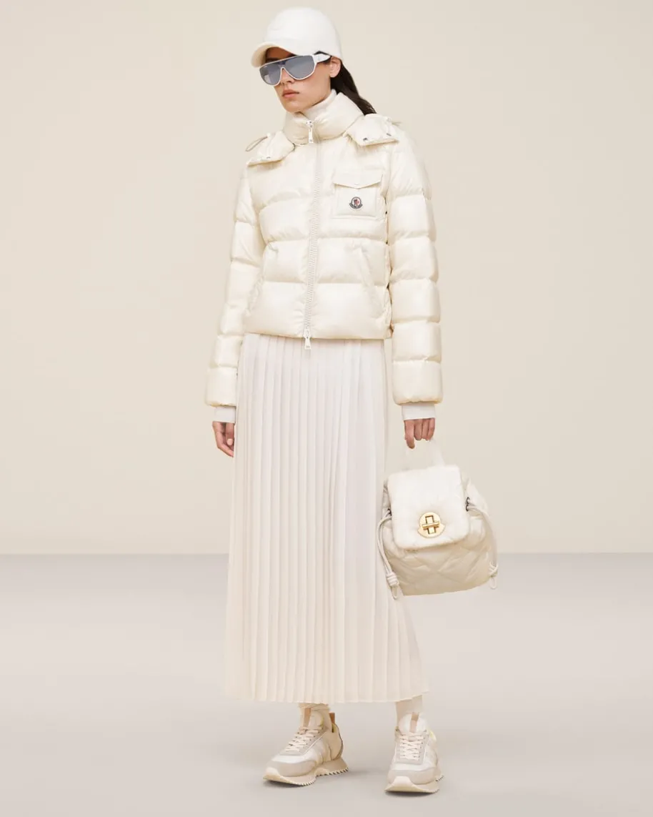 Plisseerock für Damen von Moncler in Creme. Dieses Modell präsentiert sich dankGummibund mit Kontrast-Streifen modisch-sportiv, während die klassische Plissee-Optik für ein stilvolles Gesamtbild sorgt. Der geschlitzte Unterrock vollendetden Look harmonisch.