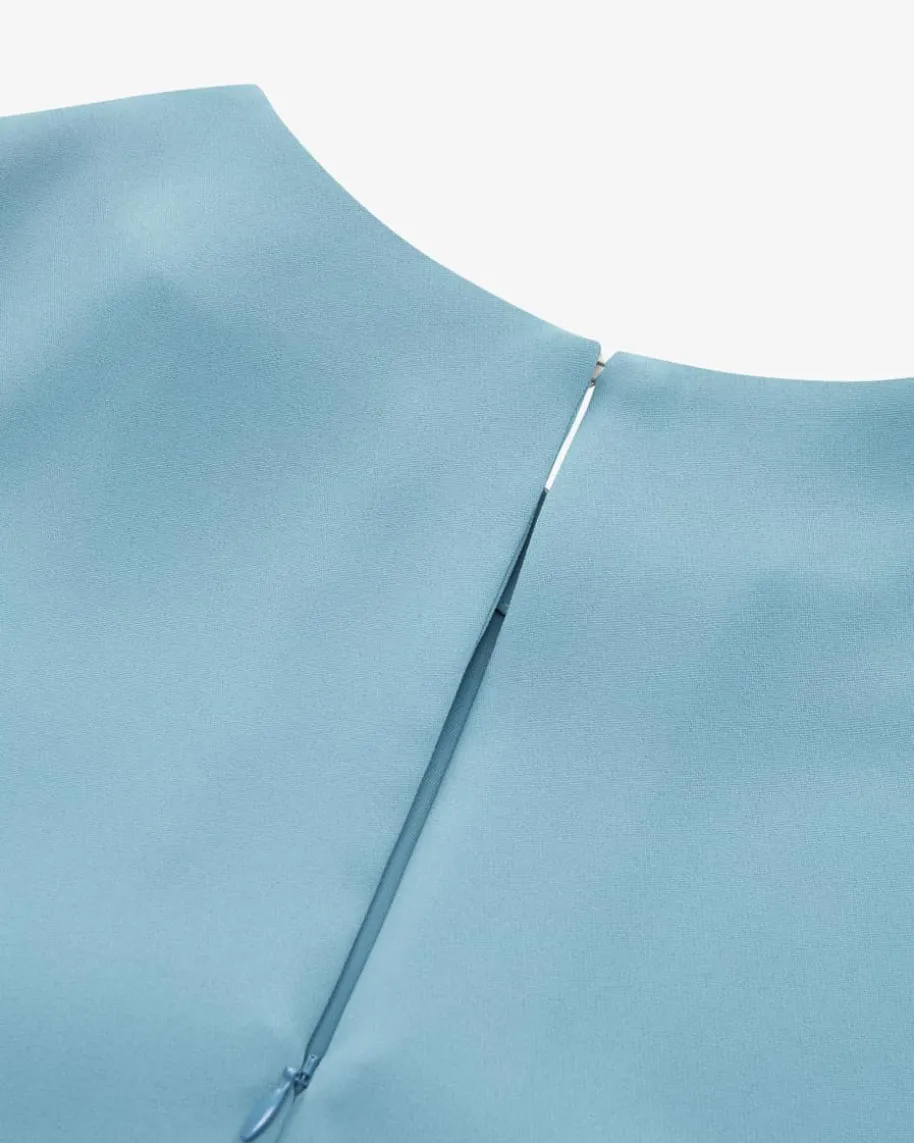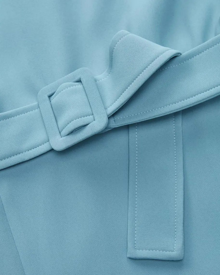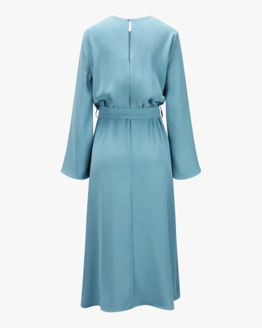 Poker25 Kleid für Damen von Parosh in Rauchblau. Das Modell besticht dankfließender Material-Qualität mit angenehmem Tragekomfort, während dasTaillenband sowie die Trompetenärmel einen femininen Look kreieren.