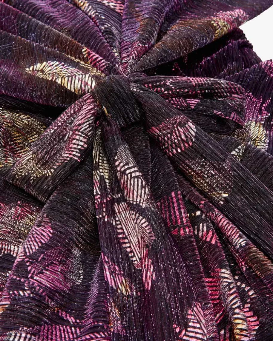 Pomme1 Abendkleid für Damen von Talbot Runhof in Violett, Pink und Gold. Indiesem Modell verschmelzen Elemente des Kaftans mit Eleganz eines klassischenAbendkleides und schaffen einen atemberaubenden, couturigen Look der bei jedemAuftritt für Aufsehen sorgt.