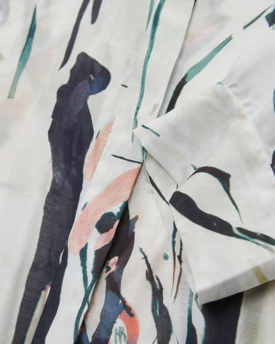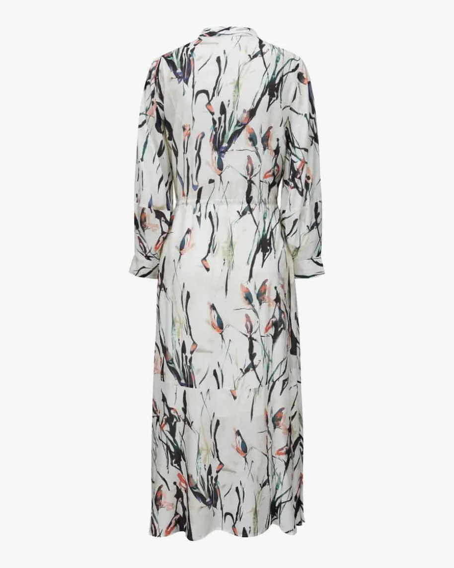 Portland Kleid für Damen von Munthe in Weiß und Bunt. Das Modell überzeugt infließend und zugleich leichter Haptik, während das farbenfrohe Dessin und dermoderne Ärmel in Ballonform das Gesamtbild gekonnt vollenden.