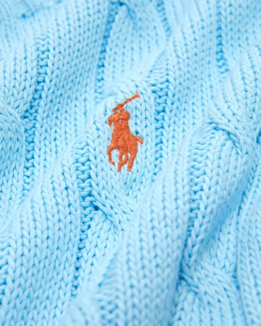 Pullover für Damen von Polo Ralph Lauren in Azur. Qualität, Lifestyle,Authentizität und zeitlose Eleganz – all das zeichnet die Marke Polo RalphLauren seit nunmehr 50 Jahren Firmengeschichte aus. Das Modell präsentiert sichdank der angenehmen Baumwoll-Qualität als zeitloser Favorit, während das moderneZopfstrick-Dessin und die klassischen Details den Look gekonnt vollenden.
