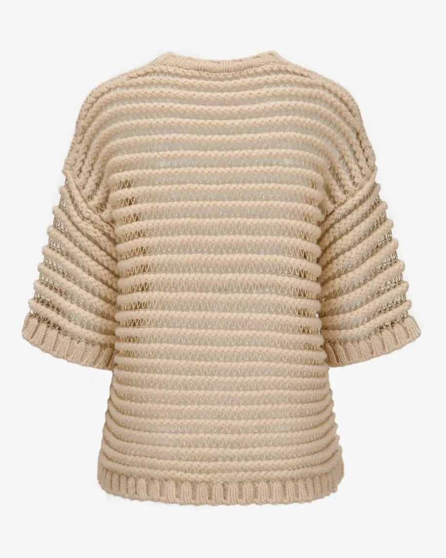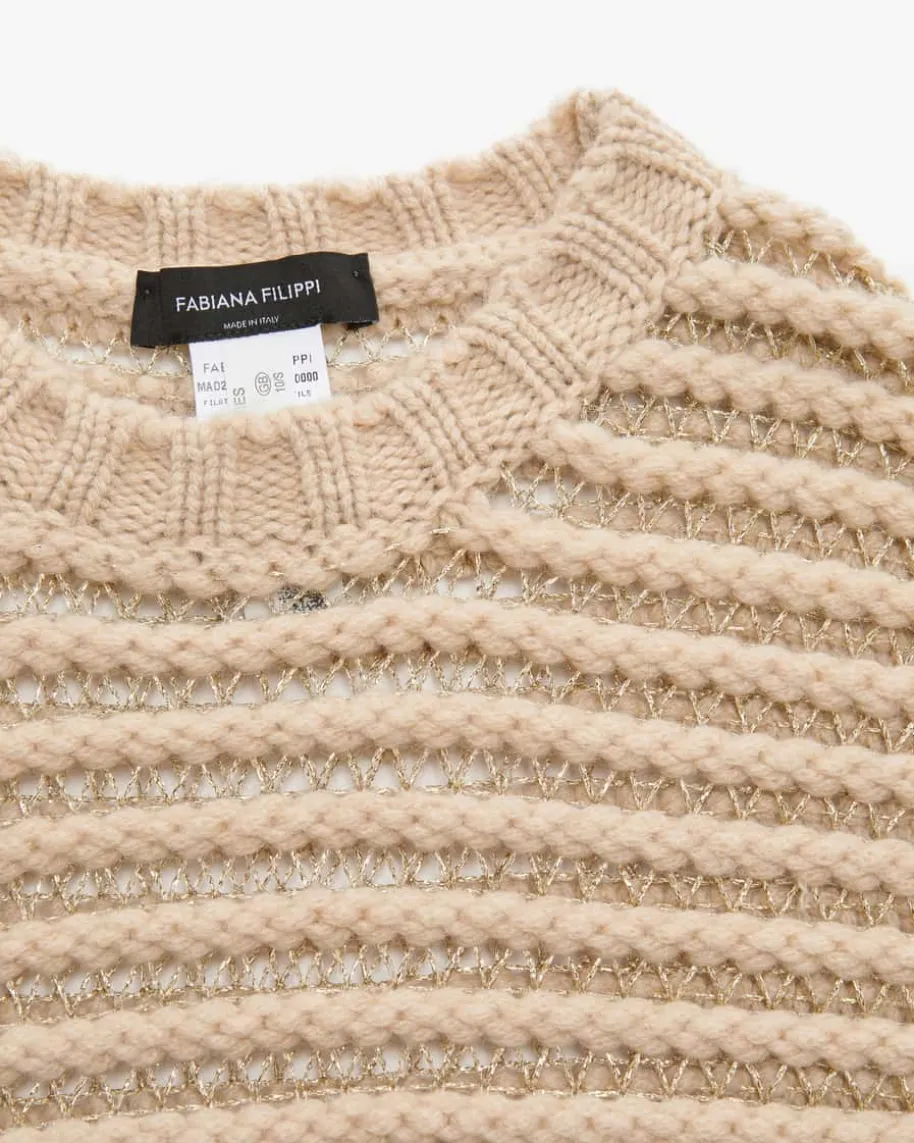 Pullover für Damen von Fabiana Filippi in Sand und Gold. Das Modell präsentiertsich in raffinierter Netz-Optik, die durch den Mix des edlen Kamelhaares mit denmetallisierten Fasern einen einzigartigen Look erhält. Die Oversize-Passformrundet das Gesamtbild modisch ab.