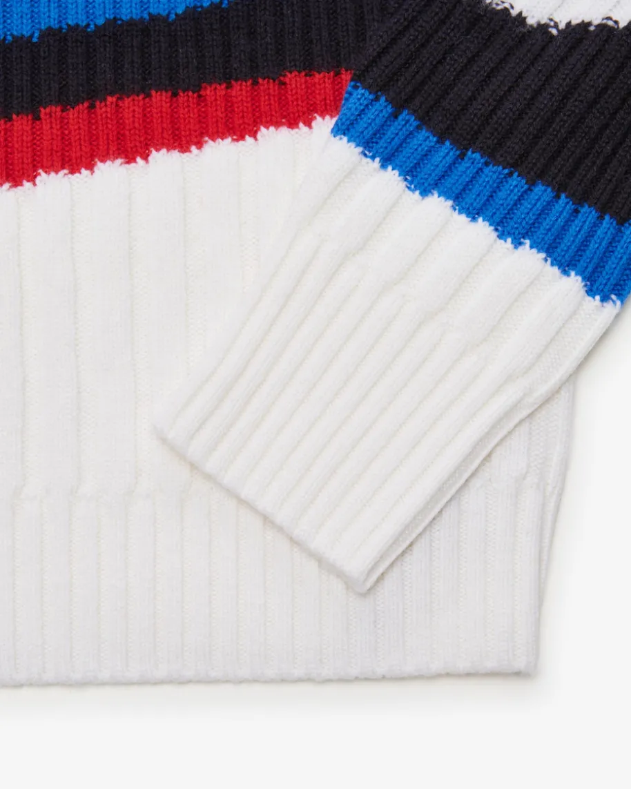 Pullover für Damen von Marc Cain in Off-White, Blau und Rot. Die deutsche Markesteht für selbstbewusste, feminine Looks. Auch dieses Modell präsentiert sichmit weicher Woll-Qualität, die angenehme Tragemomente garantiert. Das grafischeStrickmuster mit stilvollem Retro-Touch rundet das Design gekonnt ab.